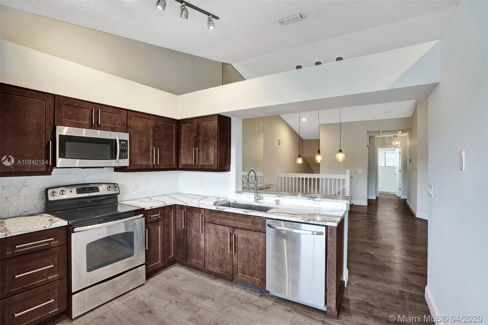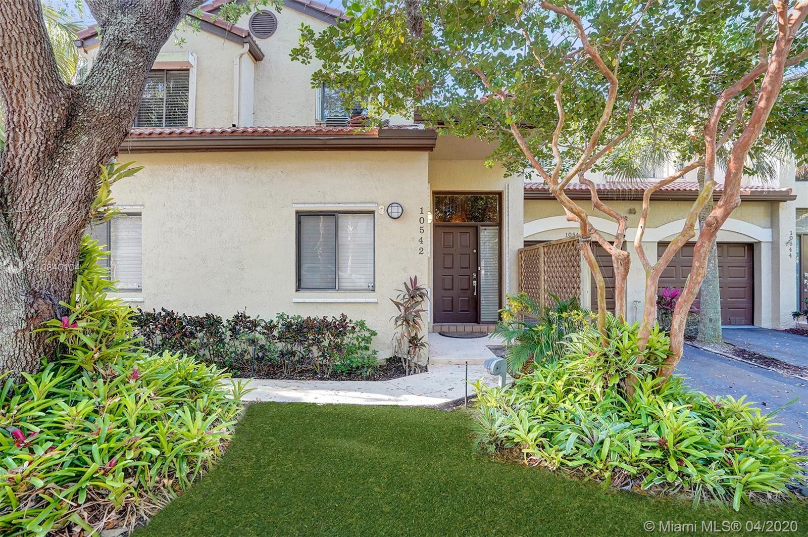 PRICE TO SELL! MOVE-IN READY, Corner updated 3 bedrooms, 2 bath coach home with 1 car garage located in the desirable area of Plantation. The unit boasts vaulted ceilings with open large floor plan, lots of natural light, and wood floors throughout. Updated stunning modern kitchen cabinetry with quartz countertops. Modern plantation shutters in the living & kitchen area. The vast living area opens up to a balcony with a water view that connects the master suite with his and hers walk-in closets. The 2nd bedroom has beautiful double french doors & can be an office or a den. The second bathroom updated with quartz countertop vanity and exquisite marble shower tile. The square footage was taken from Condo association docs which differ from the Broward County tax roll. New AC