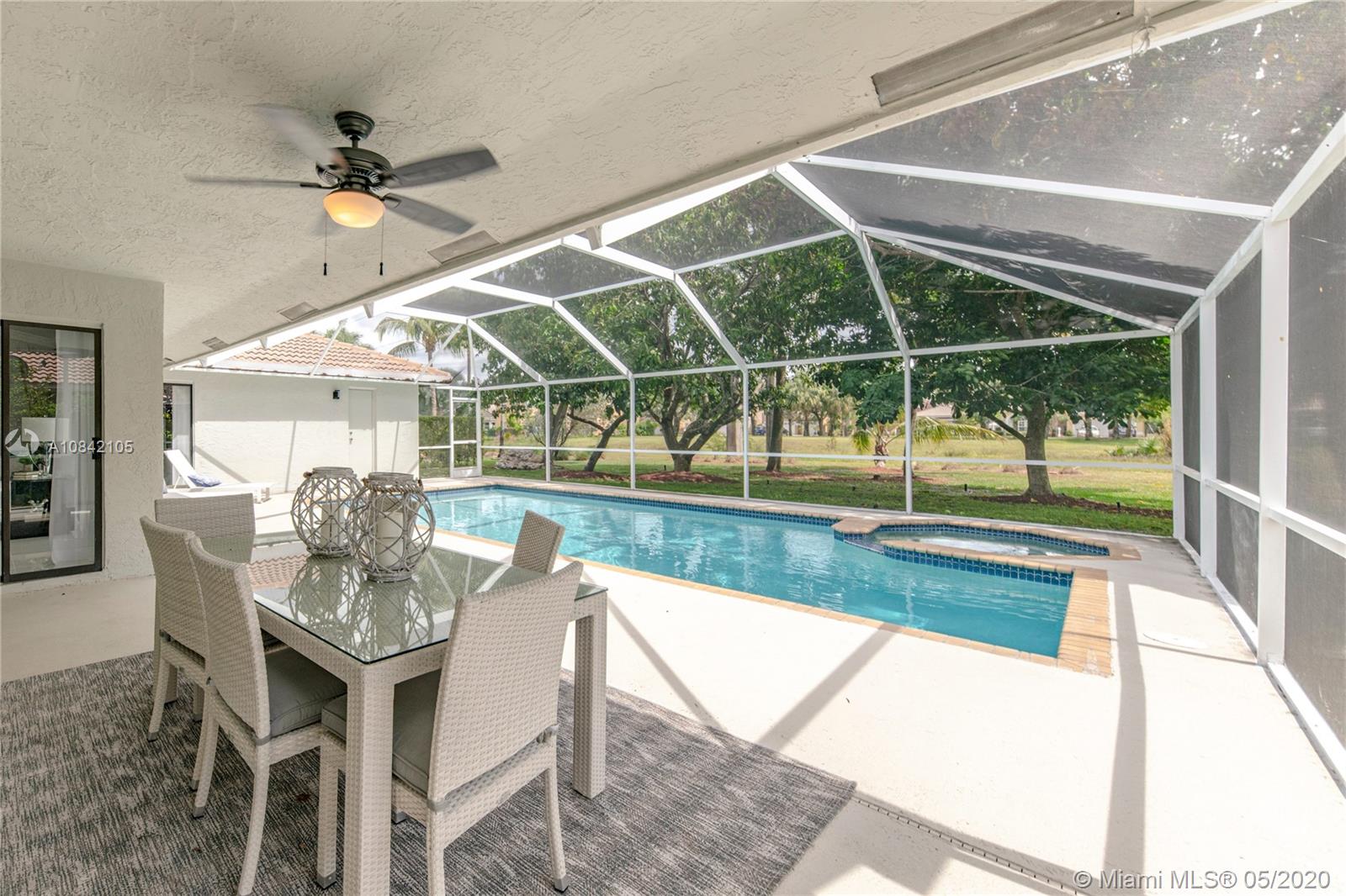 PREMIER PINE RIGE POOL HOME. Beautiful open concept floor plan features new floors, a contemporary eat-in kitchen w/ stainless steel appliances, a huge island w/ soft close drawers and storage on both sides, a built in pantry, recess lighting, a buffet, quartz countertops throughout, crown molding, new washing machine and dryer. The bathrooms feature quartz countertops, LED mirror, and LED state of the art shower heads. New AC and water heater. Perfect home for entertaining. Pool has just been refinished along with cage. All lighting, remote control fans and window treatments stay with the home.Huge back yard with all kinds of fruit trees. Low HOA and no approval necessary. Fantastic family community. Restaurants, shopping, hospitals and expressways all close by. This home is a must see!