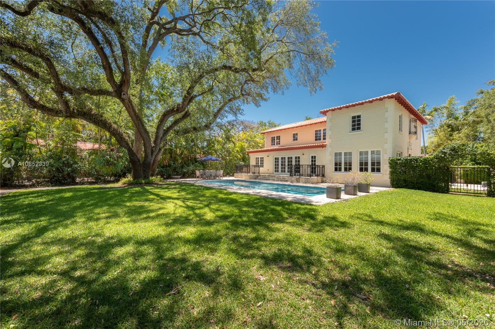 Fully renovated 5 BD/4 BA two-story residence situated on a 11,454 sf lot on a quiet street in Coral Gables. Grand entry compliments the formal dining and living room with cozy fireplace showcasing the impressive wood beam ceiling staircase. Wooden floors and warm charm introduce the updated kitchen with Subzero refrigerator, Wolf gas stove and double oven, open to breakfast area, wet bar and family room. French doors allow natural light and lead to oversized backyard, sparkling heated pool and garden. Master suite includes walk-in closet, large bathroom with dual sinks and separate shower and tub. Gated yard and driveway for privacy. Features include generator, cabana bath and 2 car garage. Minutes from Coral Gables Country Club, Venetian pool, shops and restaurants. See Broker Remarks.