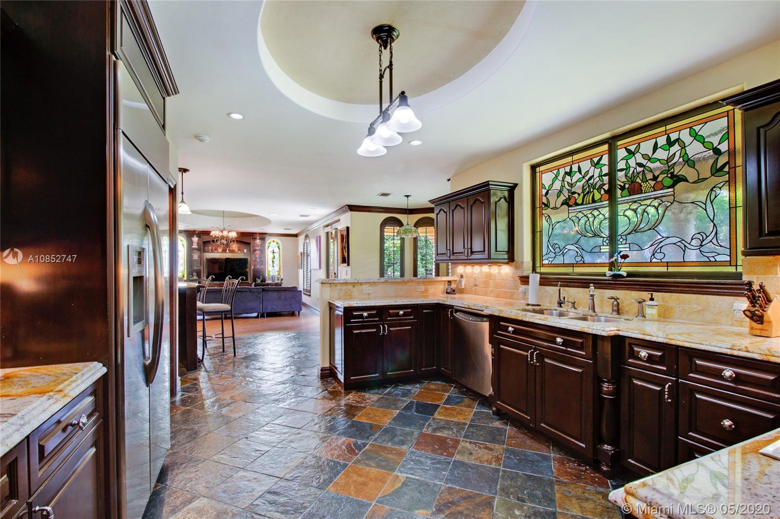 Beautiful, highly upgraded and move-in ready home in sought after Vanderbilt Park-High ceilings-crown molding, custom 10’ solid Mahogany arched doors in picturesque entranceway with stone columns- iron railing spiral staircase.Chef’s kitchen- granite countertops-custom backsplash-high end appliances-huge walk-in pantry, and vibrant stained glass windows/doors.Built-in wet bar-TV entertainment center with indoor/outdoor sound system. All bathrooms upgraded with tile mosaic on walls and natural stone floors. Large walk-in closets with built-ins.All Impact/hurricane doors and windows. Indoor/outdoor security cameras. Wi-Fi enabled alarm system, ACs, entrance swing gate-3 car garage-Architectural landscaping with lighting. Every detail of this house was carefully selected and quality crafted.