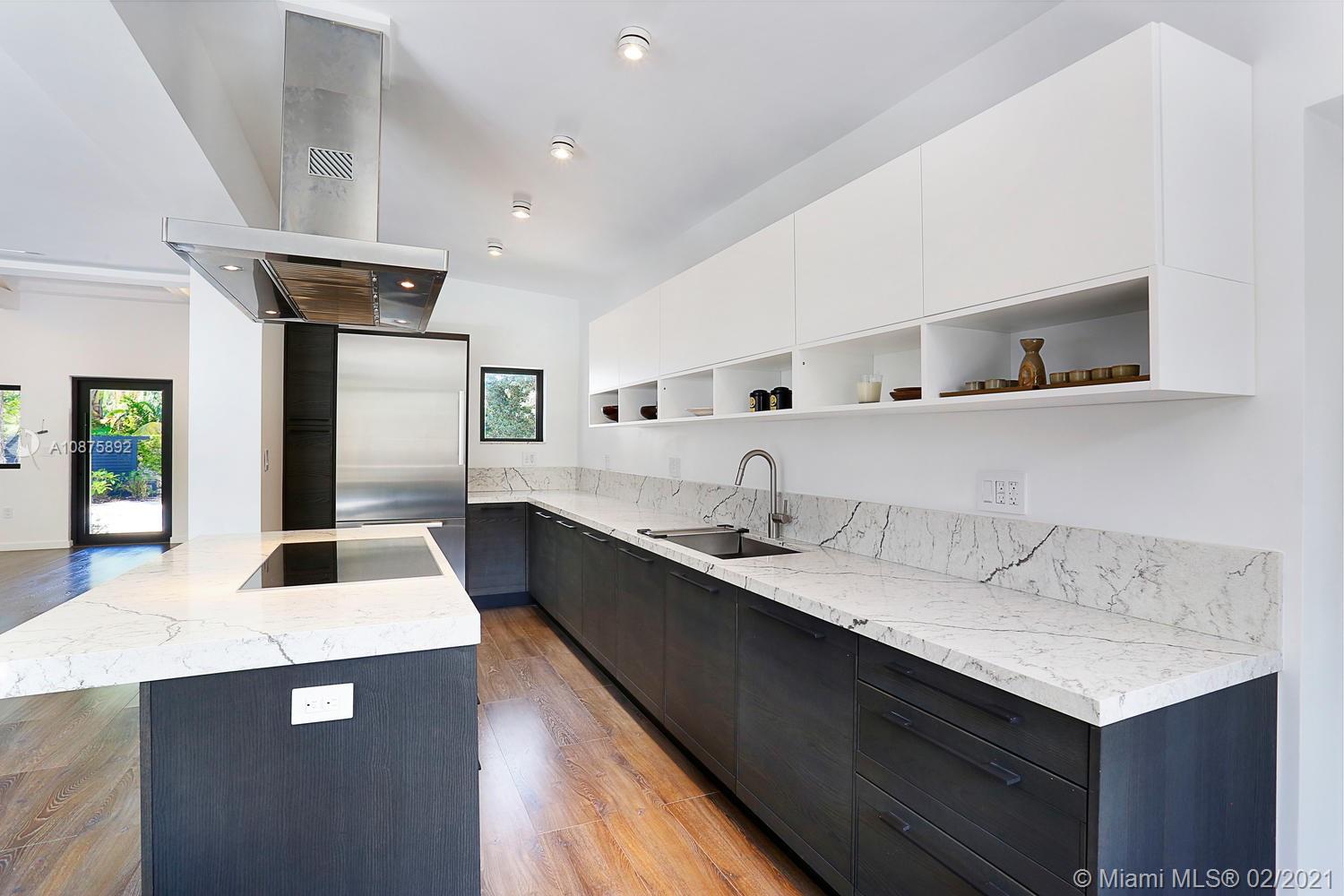 Ultra-private & architecturally unique home set behind a tall coral rock wall. Total renovation by interior architect Piret Johanson - creates a seamless blending of the home’s original character with a minimalist vibe. Light-filled living spaces feature beamed ceilings, fireplace & laminate wood flooring. Ideal open layout offers living/dining + media/family room. Main level master with en-suite bath + second level –2BR/1BA. (Pre-approved plans to add 4th BR). European-style kitchen features stone countertops, high-end appliances & cooking island. Large laundry room w/storage. Enjoy outdoor living & entertaining around the tranquil pool and lounging deck w/ built-in grill + cabana bath. Not in a flood zone. Walk to the Grove village.