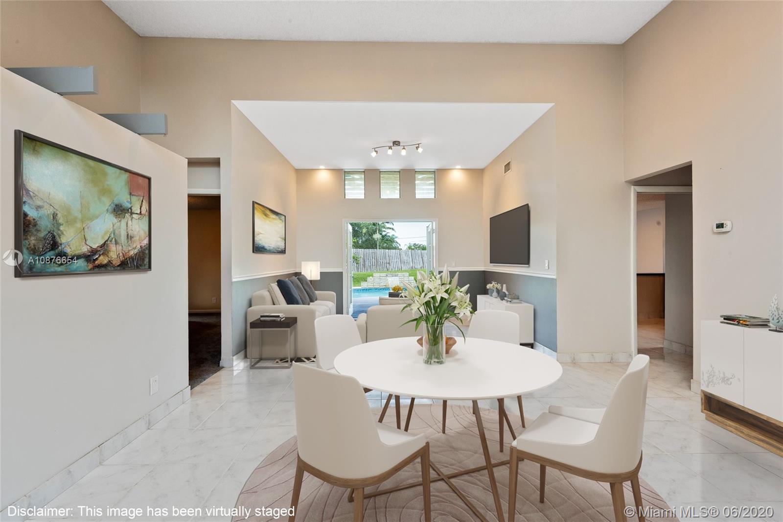 Lovely updated home on one of the largest lots in Springtree Lakes, 10000+sf of fully fenced yard + fruit trees. Pretty shaped salt water pool with cascading fountain. Covered patio with built in BBQ area. Storage shed on side. Interior living areas have been freshly painted. Updated kitchen with SS Appliances. Both baths updated – master has Jacuzzi tub & enhanced lighting. Bedrooms 2 & 3 can be opened up or kept as individual rooms. Spacious living areas with high ceilings & french doors. Home Warranty to buyer for one year at closing. Hurricane panels.