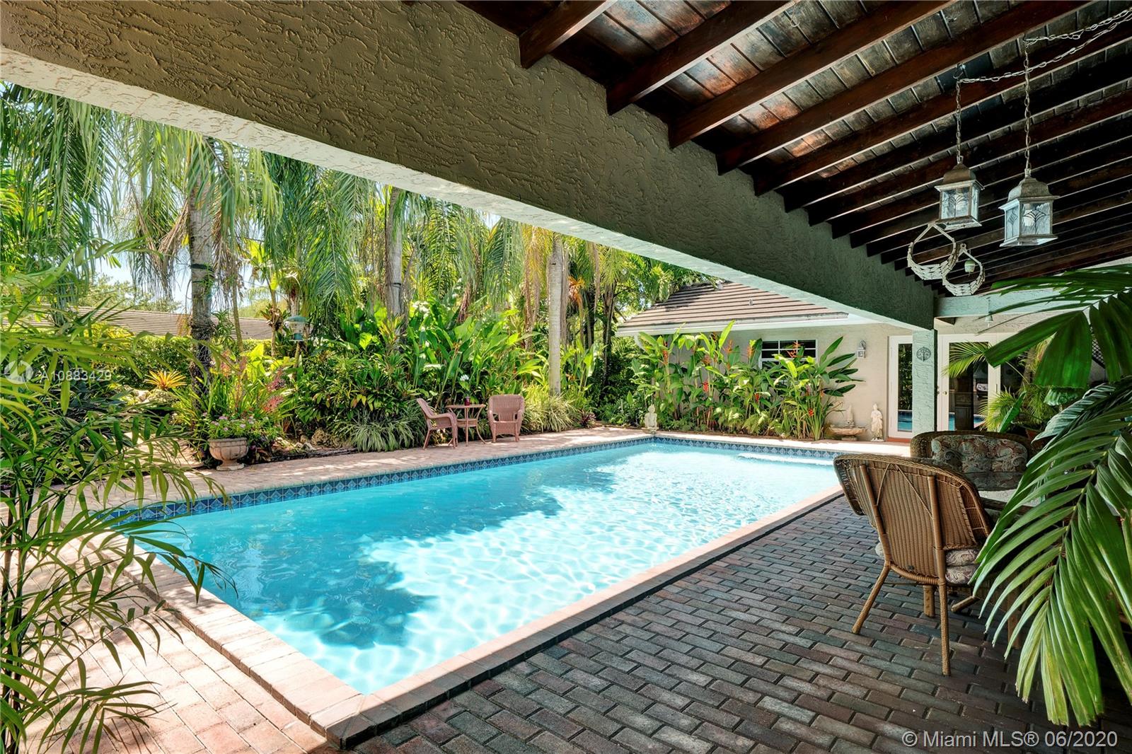 Totally rebuilt in 1995 this North Pinecrest home sits on a tranquil no through street with gorgeous tropical landscaping. Spacious open concept floor plan, high vaulted ceilings, large kitchen with counter seating great for entertaining. Beautiful views of the outdoors through impact windows and french doors, whole house generator, procelain tile and wood floors. Pinecrest elementary and close to Starbucks.