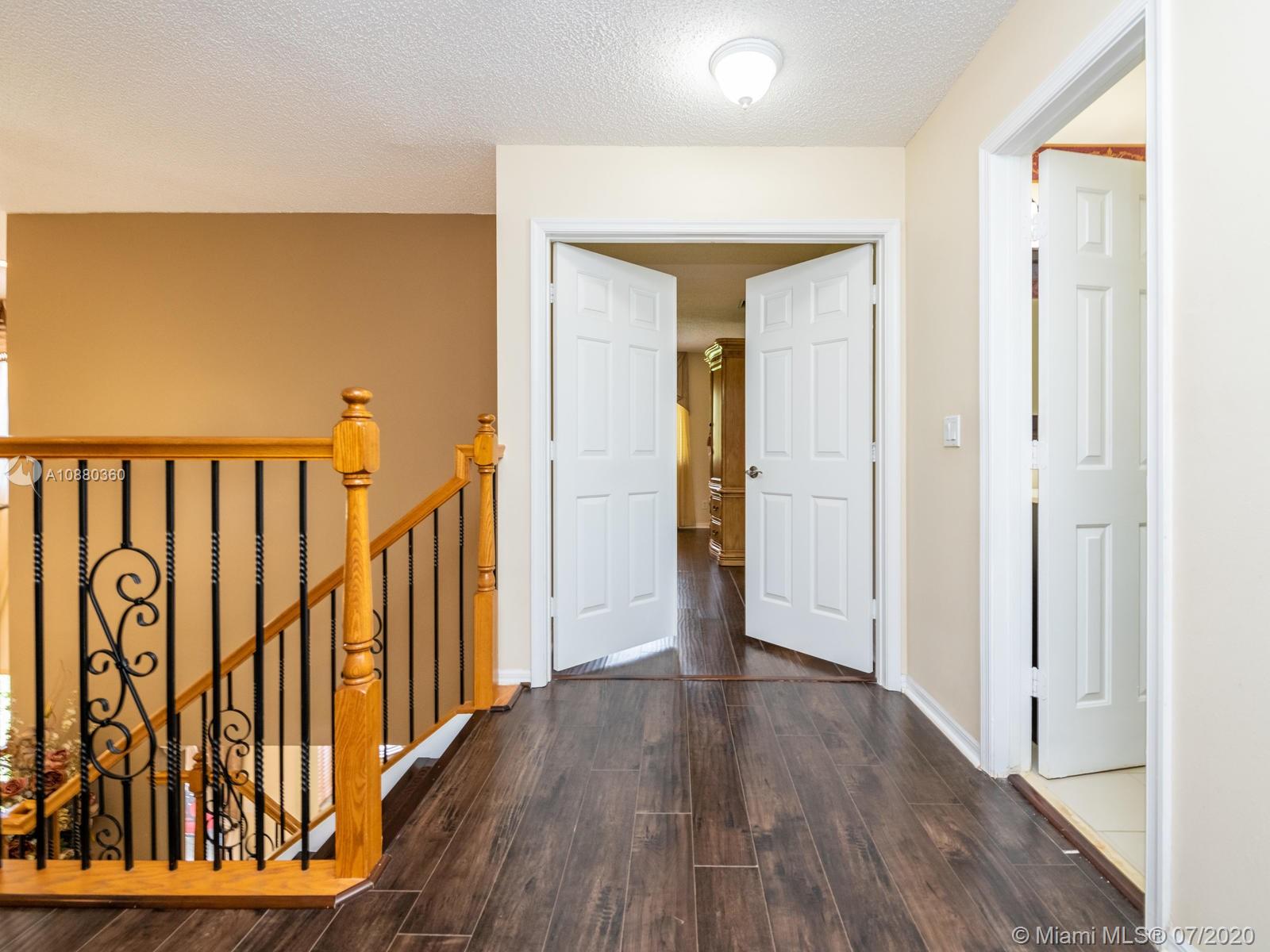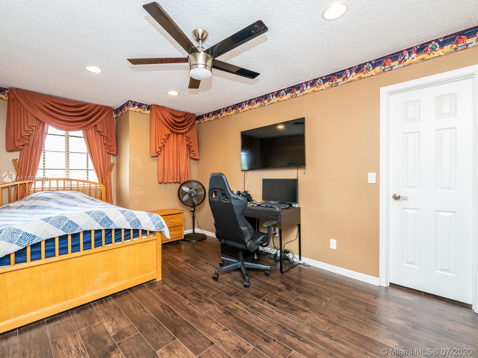 STUNNING TWO STORY FIVE BEDROOM AND THREE BATH HOME SITUATED IN A FAMILY FRIENDLY NEIGHBORHOOD! FEATURING ELEGANT DOUBLE DOOR ENTRY, GRAND LIVING AREA / DINING ROOM, HIGH CEILINGS, LARGE ONE BEDROOM ON FIRST FLOOR. AMPLE KITCHEN OFFERS STAINLESS STEEL APPLIANCES, PLENTY OF CABINETS AND COOKING ISLAND. MASTER BATHROOM WITH DOUBLE SINKS, ROMAN TUB & STAND UP SHOWER. RECENT UPDATES INCLUDE TILES ON FIRST LEVEL & WOOD ON TOP FLOOR. BEST OF ALL FENCED TROPICAL POOL BACKYARD GREAT FOR ENTERTAINING.