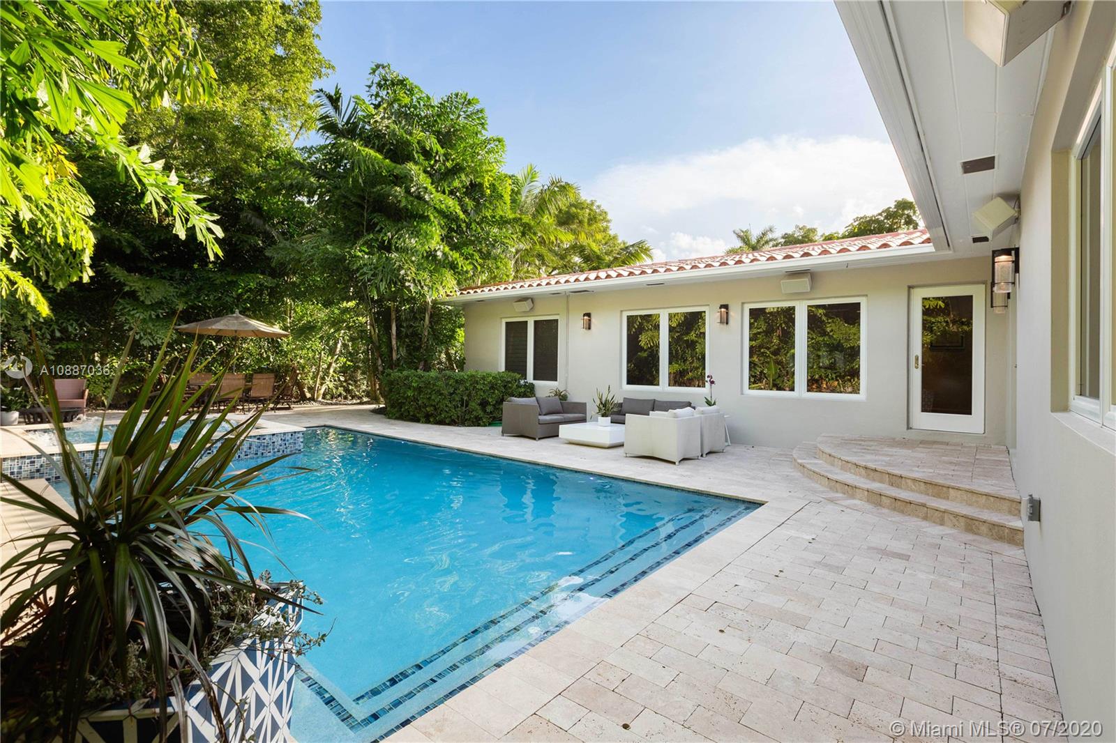 Spectacular corner 4/3 property in beautiful Coral Gables, 3230 adj. sq. ft., with meticulous attention to detail. A new master suite with high ceilings and an oversized three level closet. The spa like bathroom includes separate his & her toilettes, large jacuzzi tub and frameless glass steam shower. Hardwood floors throughout. Impact windows and doors. Plenty of natural light. Kitchen is set with luxury grade granite counters, stainless steel double ovens, a french-door refrigerator & a knob-less cooktop. The backyard is a tropical oasis, with lush landscaping and a contemporary pool w/ swim-in-place jets and a large spa. Mosquito mitigation misters are found throughout front and backyard. Backyard is fully fenced, and entire property is surrounded by invisible dog fence. 2 car garage.