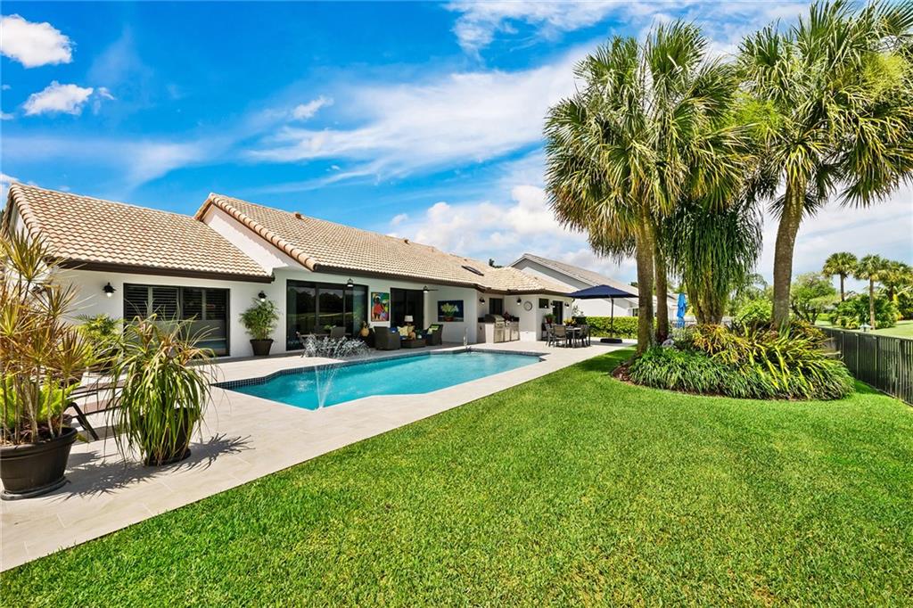 Welcome to this fully renovated home located in gated Boca Woods Country Club. Stunning property with four bedrooms plus a family room,two and a half bathrooms, two car + golf cart garage,circular driveway, impact windows,doors,skylights & shutters. When you enter this home you will fall in love. Features include custom kitchen with double oven,quartz counter tops,dry bar,hard wood floors throughout living area, spilt bedroom. Backyard oasis includes oversized patio, pool,covered lanai, summer kitchen with DCS bbq.Country Club offers two 18 hole golf courses, driving range, putting green,tennis, fitness center, pool, pickle ball, casual & fine dining. Mandatory membership $65,000 paid 10 days prior to closing.$30,000 refundable when you sell home.Please see attachment for yearly dues&fees.