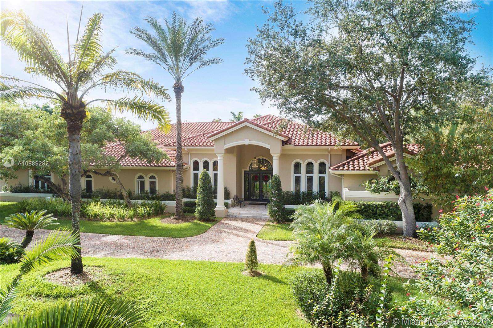 Live an inspired lifestyle in this one-story home nestled on almost 2 acres on a quiet North Pinecrest cul-de-sac. Tall iron gates, old Chicago brick driveway, 6 ft. high magnificent coral rock walls and park-like grounds create privacy and security. 14’ ceilings, tall doors and windows, and a great flexible floorplan gives you countless design choices. In addition to the family room and office, there is a 510 SF newly renovated entertainment room perfect for a playroom, home theater and more. The master suite has a 440 SF closet, shoe closet and 440 SF of flex space for another closet, gym or storage. Full basketball/sport court with LED lighting. Large saline pool. 6-car garage. Impact glass. Lots more! A must see.