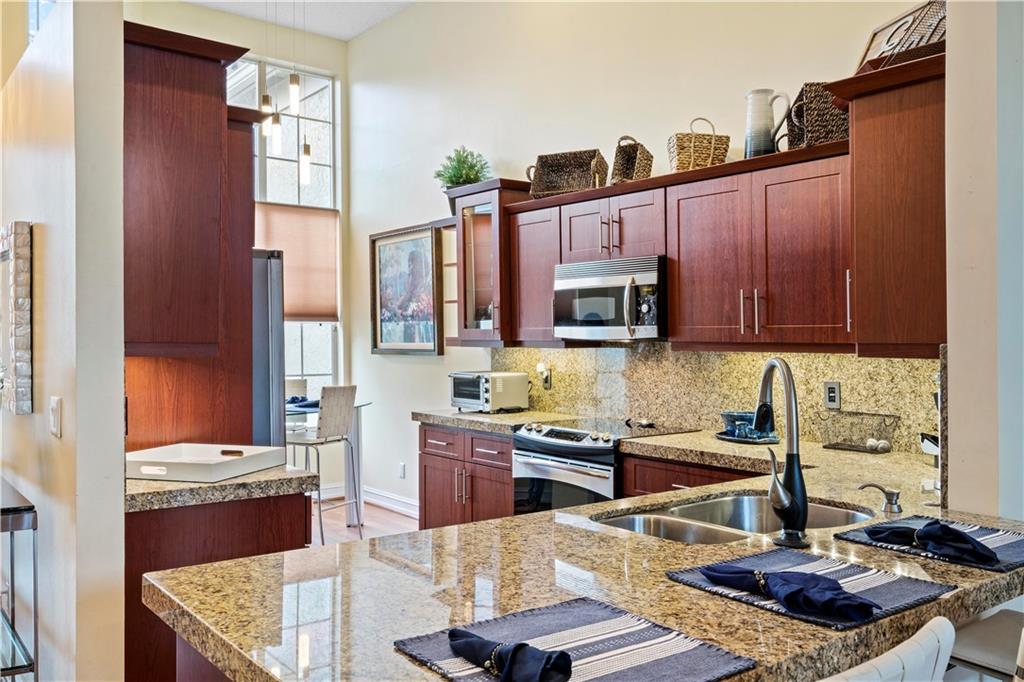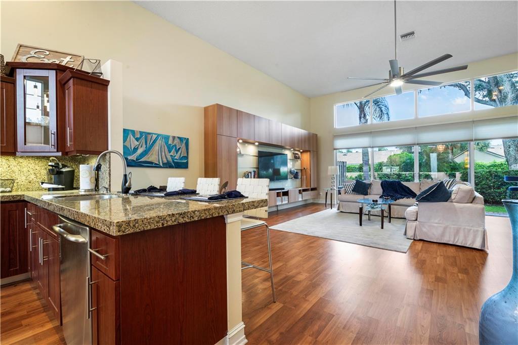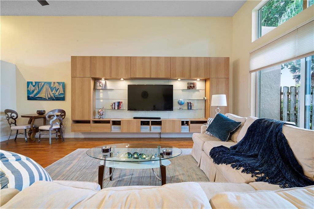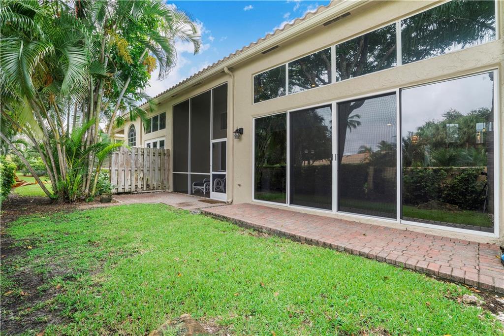 2/2 Townhouse in prestigious Boca Golf Club. Ground floor, NO STAIRS, open floor plan with laminate flooring throughout w/14 ft ceilings. Eat-in kitchen w bay window overlooking serene garden. Cherry wood cabinets with accent lighting, 2" granite counter tops/ back splash and S/S appliances. Large family room has custom built-in Entertainment center. Glass doors across entire back of room opens to a brick patio and large, private courtyard. Glass doors to the right open to a spacious screened patio connecting to owners suite with custom closets. Updated baths feature Expresso cabinetry, granite counter tops, & 18x18 ceramic tile. Guest bedroom converts to den/ office with a cherry wood Murphy Bed. Whirlpool Duet W/D & granite top in Laundry room. Pet friendly. Pool nearby, 24-hr gate.
