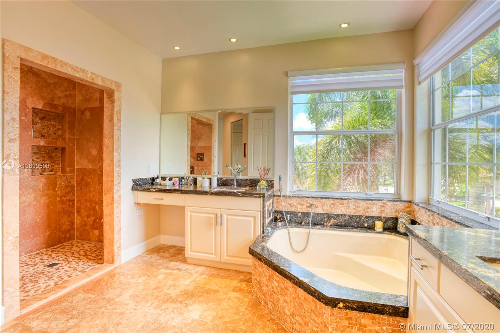 Live in the paradise in this spectacular pool home with plenty of natural light and amazing lakes views from every angle. These 5 bedrooms+office & 4.5 bathrooms house is located at the end of a cul-de-sac on SUNSET LAKES. Large patio w/travertine floors, pool and jacuzzi; 3 cars garage+parking in the driveway. Marfil marble flooring downstairs & laminated upstairs. One bedroom with full bath downstairs. White quartz countertop & shaker style cabinetry with stainless steel appliances. NEST thermostats & SONOS sound surround system outside. 24/7 manned & gated with security guard Guardhouses. This community offers a resort style clubhouse, pool, spa, fitness center w/classes, basket & tennis courts. Minutes to top schools, best supermarkets, expressways, shopping centers, hospitals & more!!
