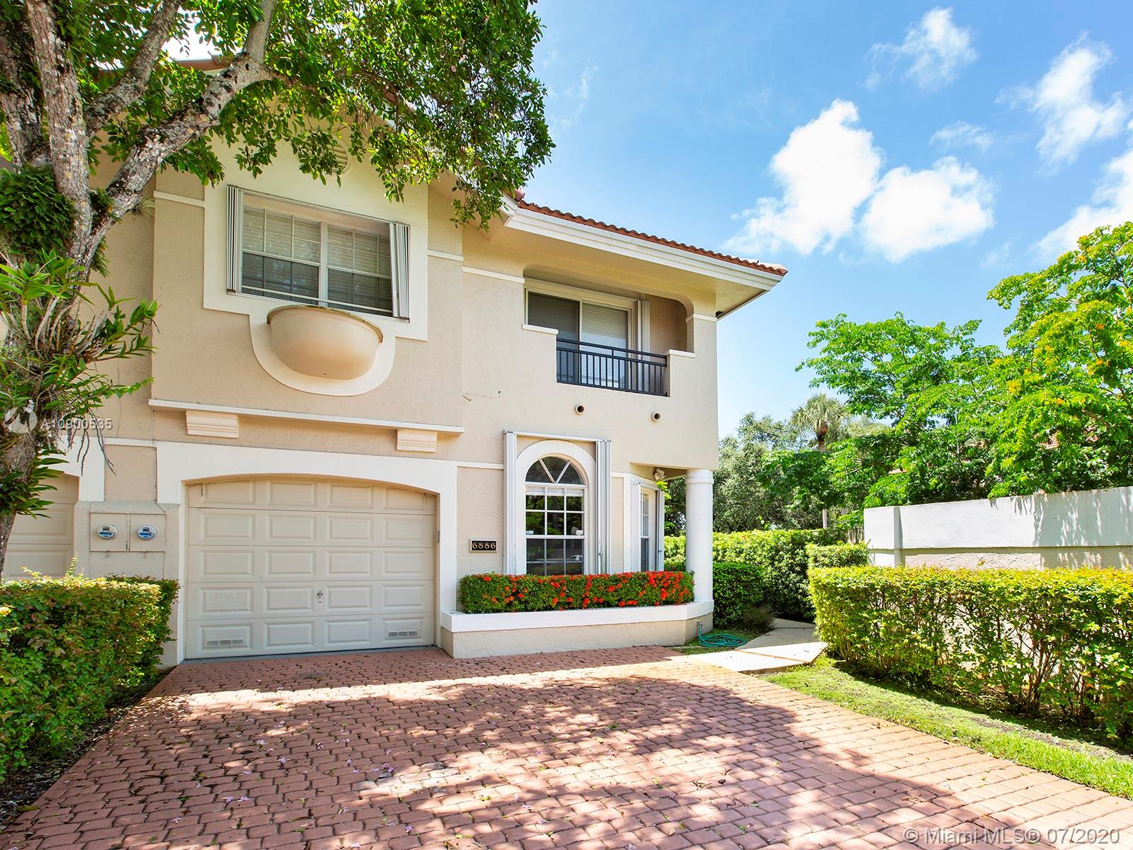 Rarely available exclusive Pinecrest elementary 2-story townhome in Sutton Place, a gated community of only 28 units. Corner unit which is bright and sunny with updated wood kitchen, wood floors, marble master bath, skylight, high ceilings, 1-car garage, lovely oversized patio and oak trees. Very well located unit within the community. Walk to Dadeland Metro, and close to everything with best schools and all the Village of Pinecrest extras.