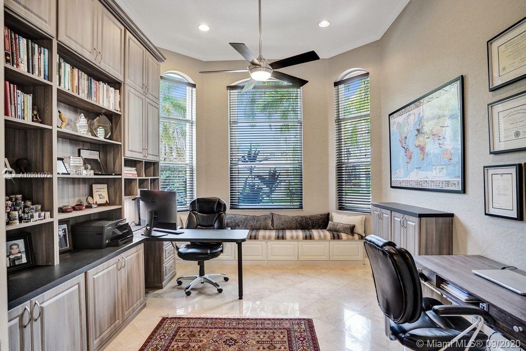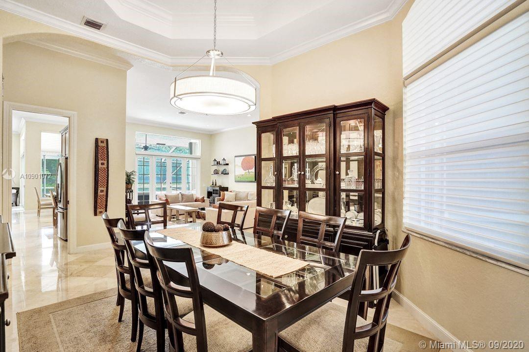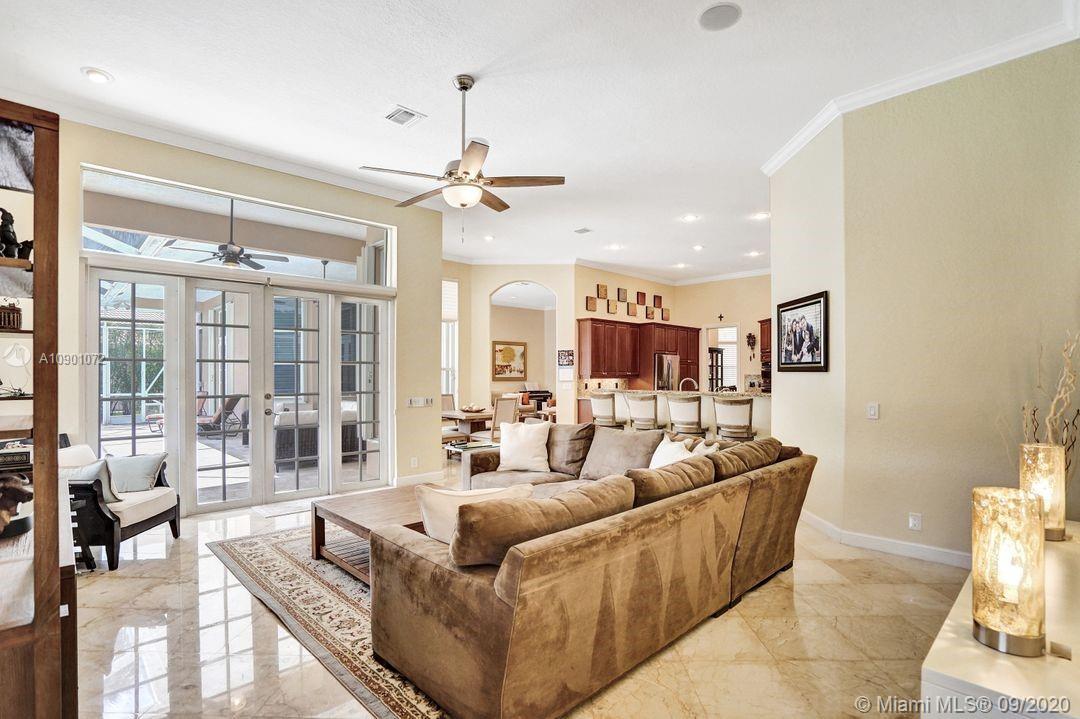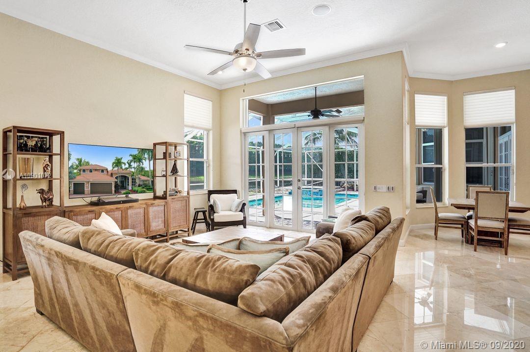 Elegant Mystic Model located in the prestigious gated community of Victoria Isle at Weston Hills Country Club. This sprawling property is placed perfectly amidst a royal palm tree-lined street. Enjoy 5 generous bedrooms plus den and office Attention to every detail in this meticulously maintained home. Marble floors flow throughout living areas. Chefs delight kitchen with wood cabinets, granite counters, center island, and double ovens. Extensive crown moldings. Commercial built-in grill with expansive covered and screened patio. Travertine patio with long unobstructed lake views to the berm. Walk to community park. Lushly landscaped, oversized lot with grand paver circular driveway, full accordion protection. 3 car garage currently houses additional full bed/bath.