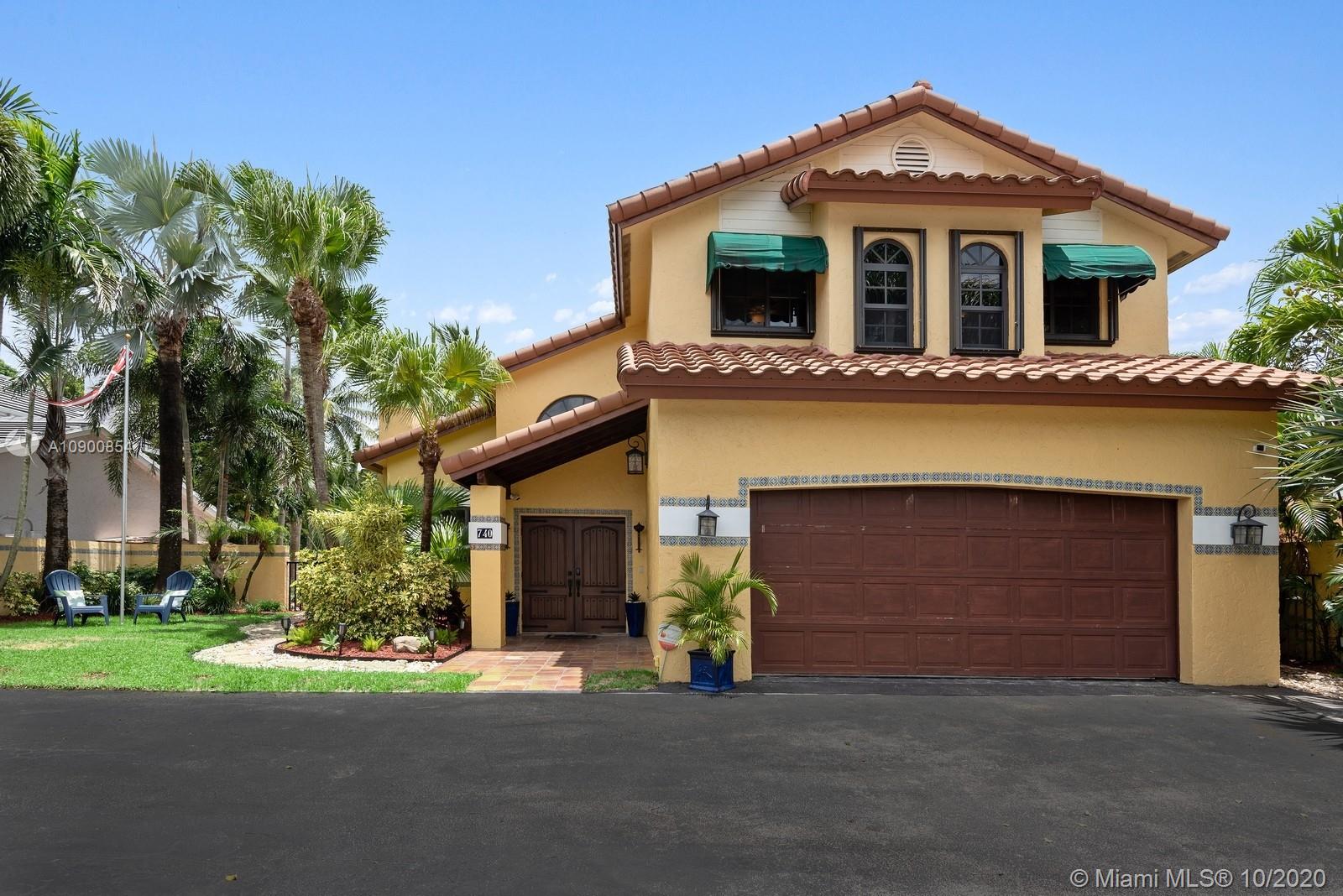 Tropical meets Mediterranean style. In the most desirable neighborhood, this unique and rarely available golfer’s dream home opens to a majestic vaulted ceilings featuring: 4 bed/3 bath, a living room with a fireplace, a kitchen, a family room & a florida room. You will appreciate the indoor/outdoor flowing throughout this residence. The multiple outdoor entertaining areas include an over sized pool, taking part of a tropical paradise. The 2nd floor offers 2 bedrooms and a spacious master suite which extends to a large outdoor terrace, presenting a spectacular endless views. No HOA. High impact windows & doors and a generator included for the buyer’s peace of mind. This is a must see for serious buyers.