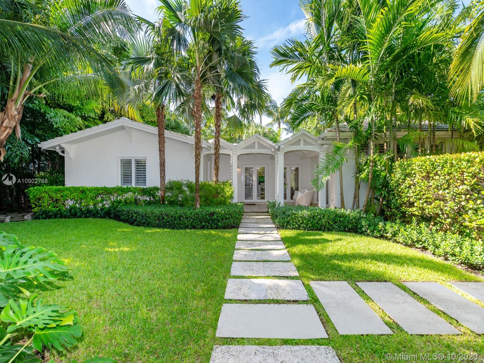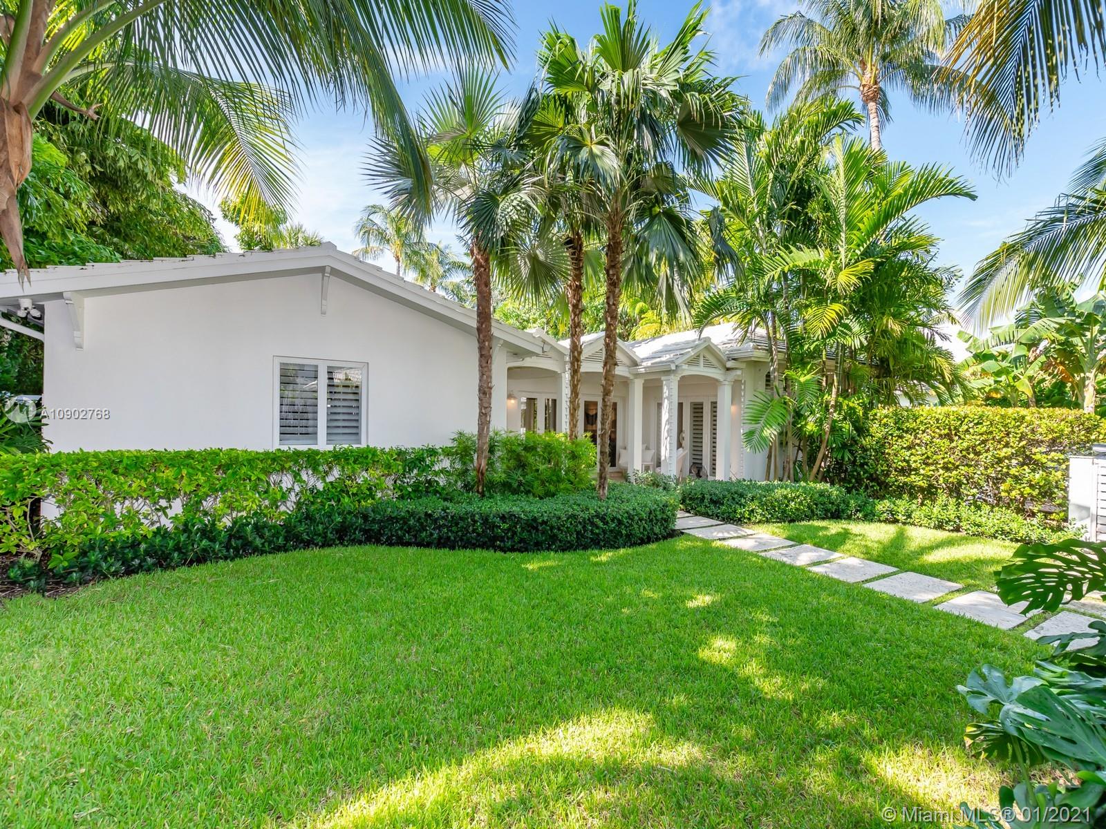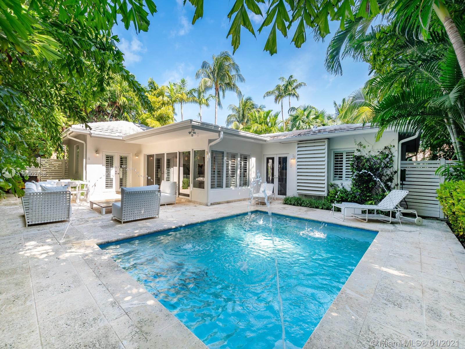 Palm beach chic garden style home with covered front porch and flow through views. This 4 bedroom 3 bath residence is unique in its style and vibe. A fabulous cabana style master suite overlooks the tropical garden and spa quality pool. A covered porch opens into a great room, dining, and family rooms. A white cook's kitchen overlooks a custom-designed pool with water features and private garden setting. A large gated yard both front and back allows for family entertaining. Impact glass. One story living at its finest.