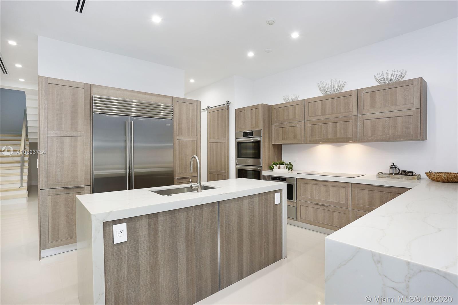 This spectacular brand-new construction home in South Gables is nothing short of amazing. The entryway leads to a spacious open floor plan living area & huge wall-to-wall 9ft stackable sliding glass impact doors w/ stunning pool views. The gourmet kitchen is made up of Subzero & Bosch appliances, waterfall quartz countertops, a giant walk-in pantry, & custom Spaniard cabinetry. The light cove above the family room sets the ambiance for this perfect seating area. Every room is given its own private bathroom & walk-in closet. The master bedroom offers an enormous walk-in dressing room closet & the gorgeous master bathroom with its freestanding tub & separate shower. The backyard has a covered patio terrace & low maint. due to the fashionable Shellock Pavers flooring & artificial turf area.