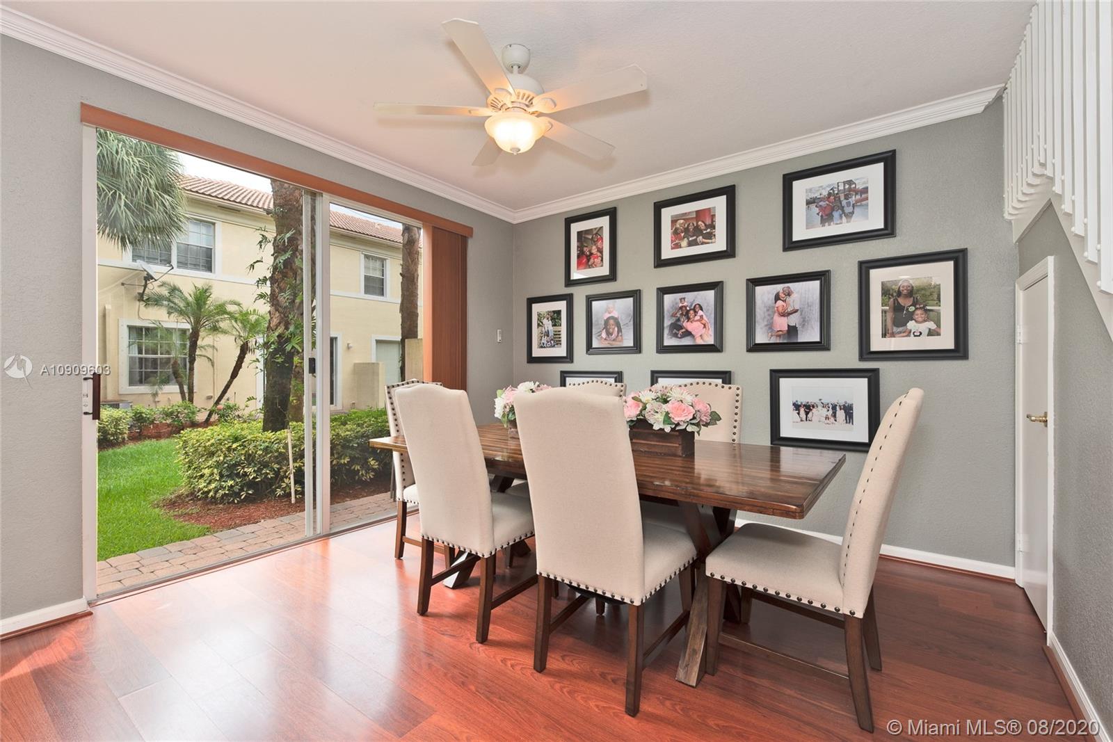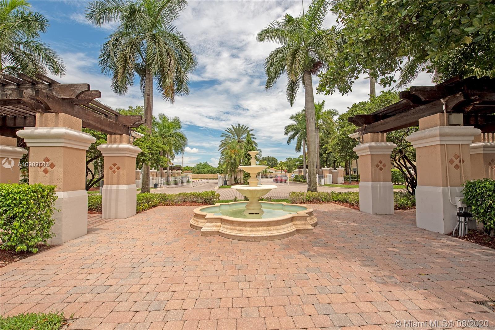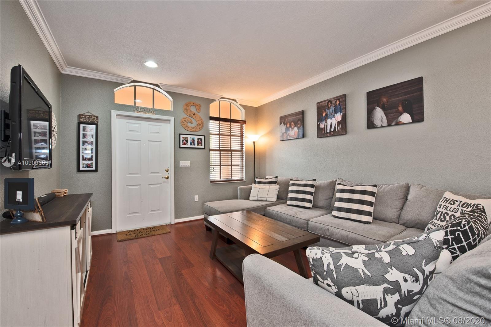 Beautifully kept 3 bedroom 2.5 bath Townhouse in sought after Murano, Miramar. Spacious kitchen with all stainless steel appliance. Breakfast bar. Wood floors downstairs and upstairs. Crown molding throughout the entire home. Knockdown texture walls. Large stairs landing. Well kept master suite bathroom. Newer A/C replaced in 2017. Storm shutters. 1 car garage plus drive way space for 2 more cars! Well maintained Guard gated community. Pool, gym, tennis courts and tot lot for family entertainment. Conveniently located close to major roads and highways. Move-in ready!