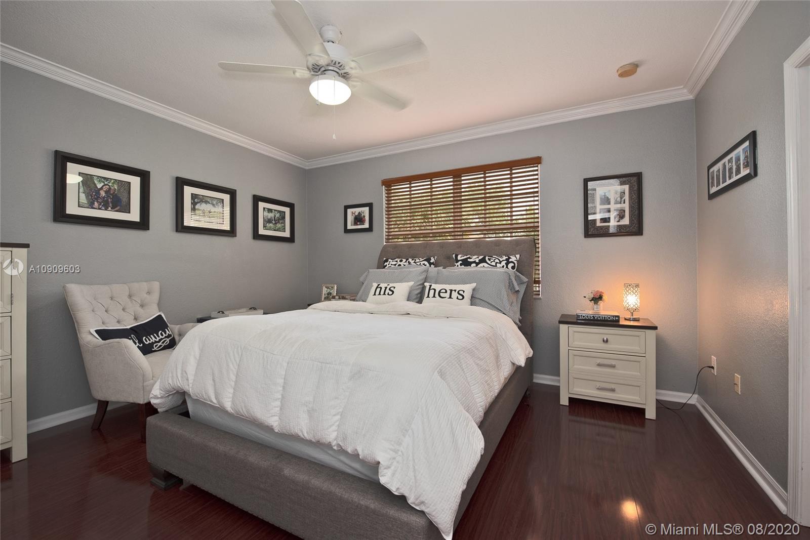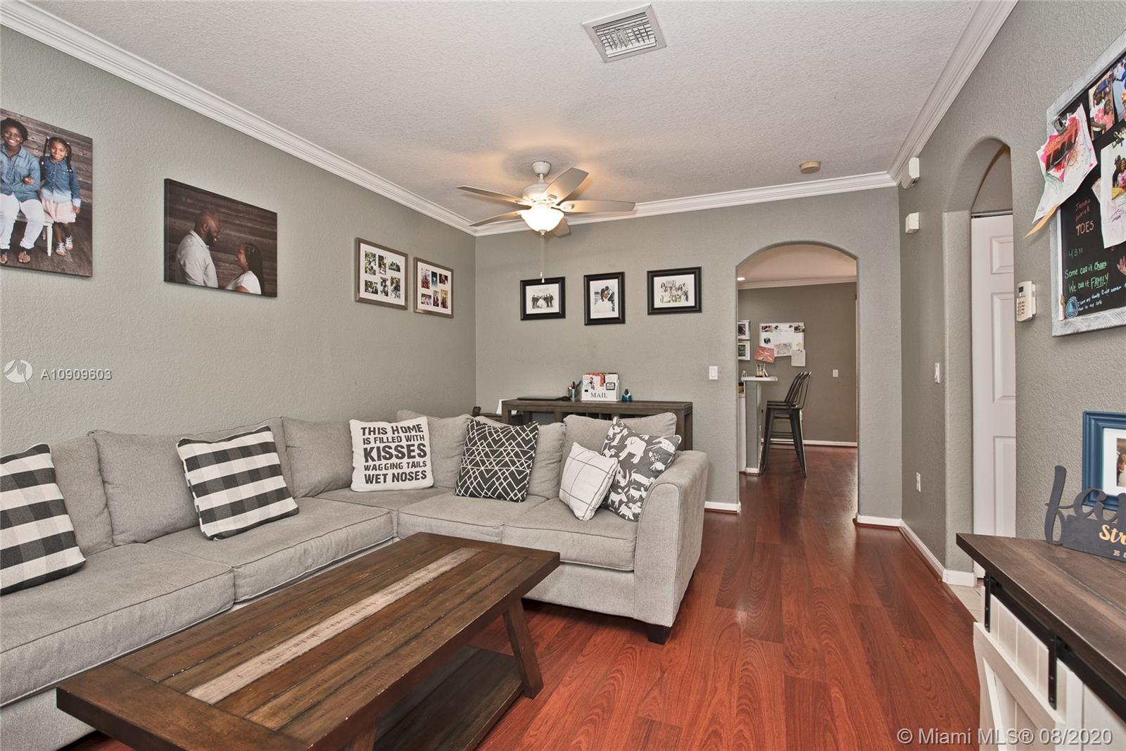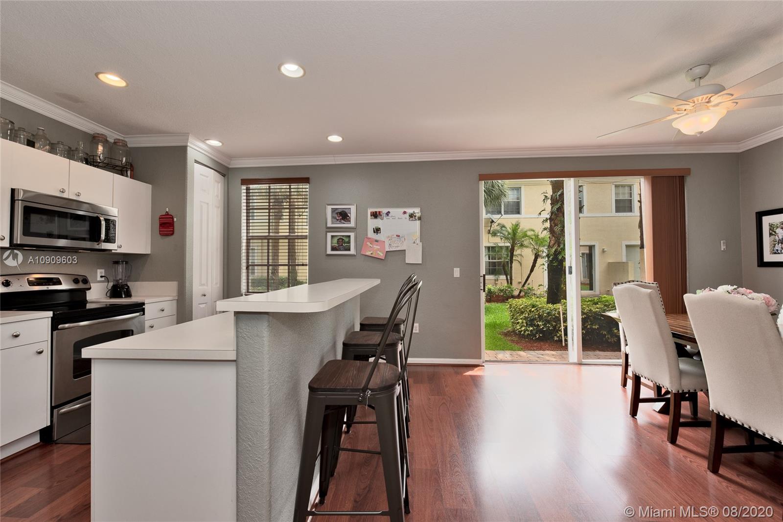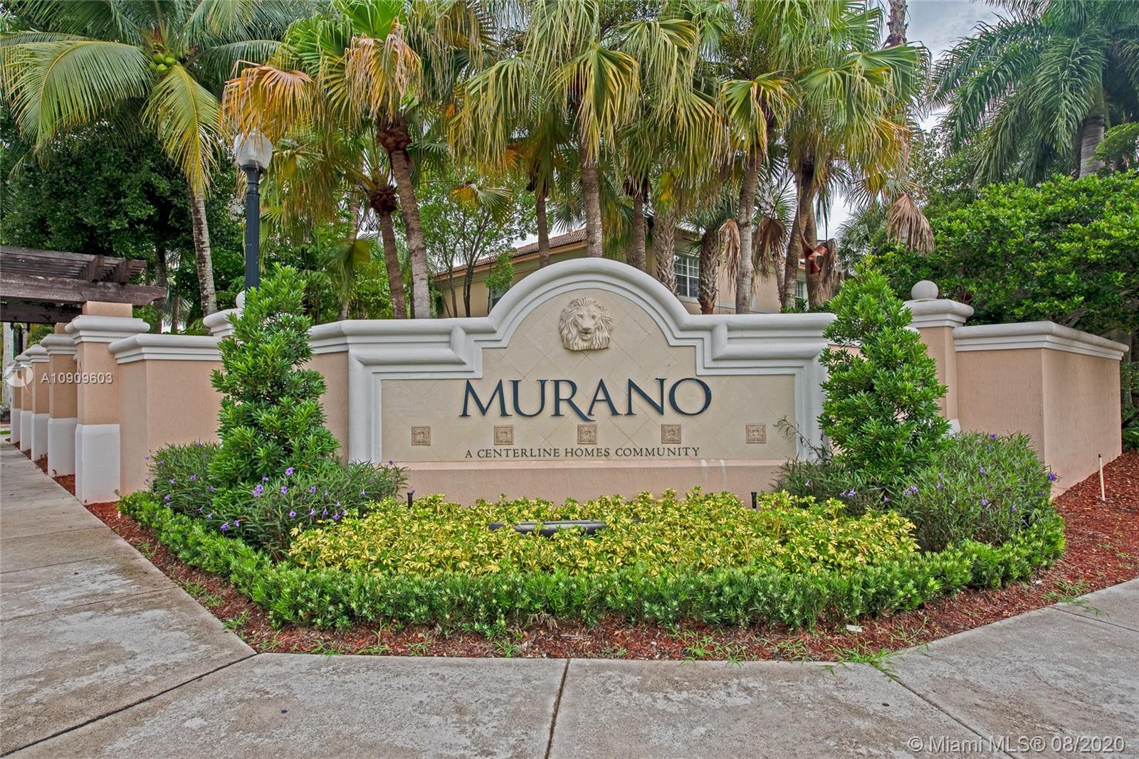 Beautifully kept 3 bedroom 2.5 bath Townhouse in sought after Murano, Miramar. Spacious kitchen with all stainless steel appliance. Breakfast bar. Wood floors downstairs and upstairs. Crown molding throughout the entire home. Knockdown texture walls. Large stairs landing. Well kept master suite bathroom. Newer A/C replaced in 2017. Storm shutters. 1 car garage plus drive way space for 2 more cars! Well maintained Guard gated community. Pool, gym, tennis courts and tot lot for family entertainment. Conveniently located close to major roads and highways. Move-in ready!