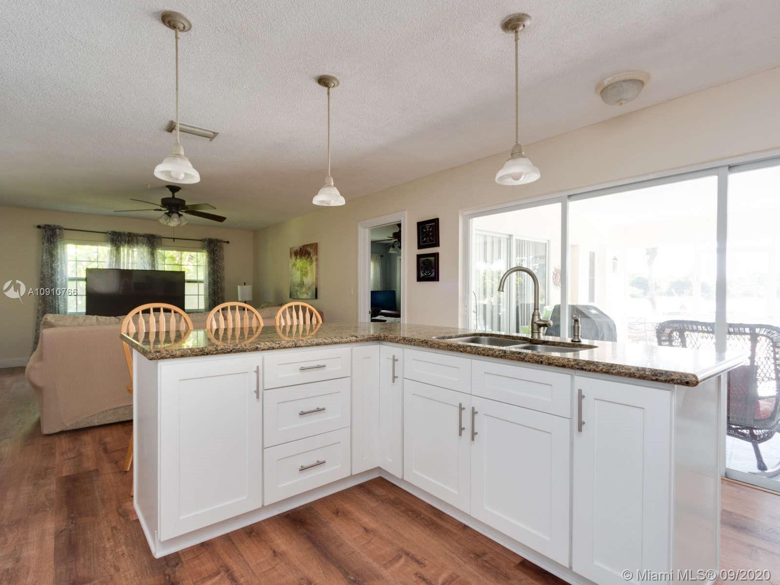 Waterfront home in Plantation on 1/3 acre. New PVC & Perma Plumbing under slab New Shaker White soft close cabinets, new flooring 5 ton AC 50 gallon WHTR roof 10/2013 Granite counters Large Island Formal living & Dining room eat in kitchen family room fresh paint in & out oversized two car garage used as storage and 4th bed. Laundry and additional storage room. Double front Fiberglass dr. Three bed two bath Large screened in patio, pool fenced yard Fruit trees circular drive 4 zoned sprinkler garage dr. opener & keypad 7 ceiling fans Stainless steel appliances, service contract, tented with termite warranty & lawn service. Walk to Fig Tree & Heritage Parks Close to all schools and amenities This is a nature lover and artist dream home in great location with a beautiful private water view