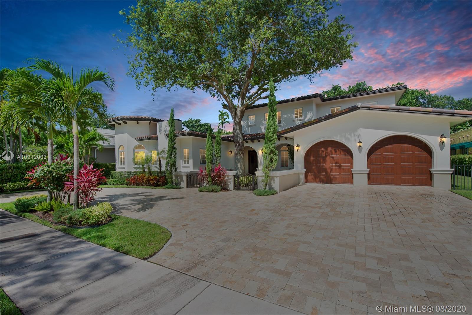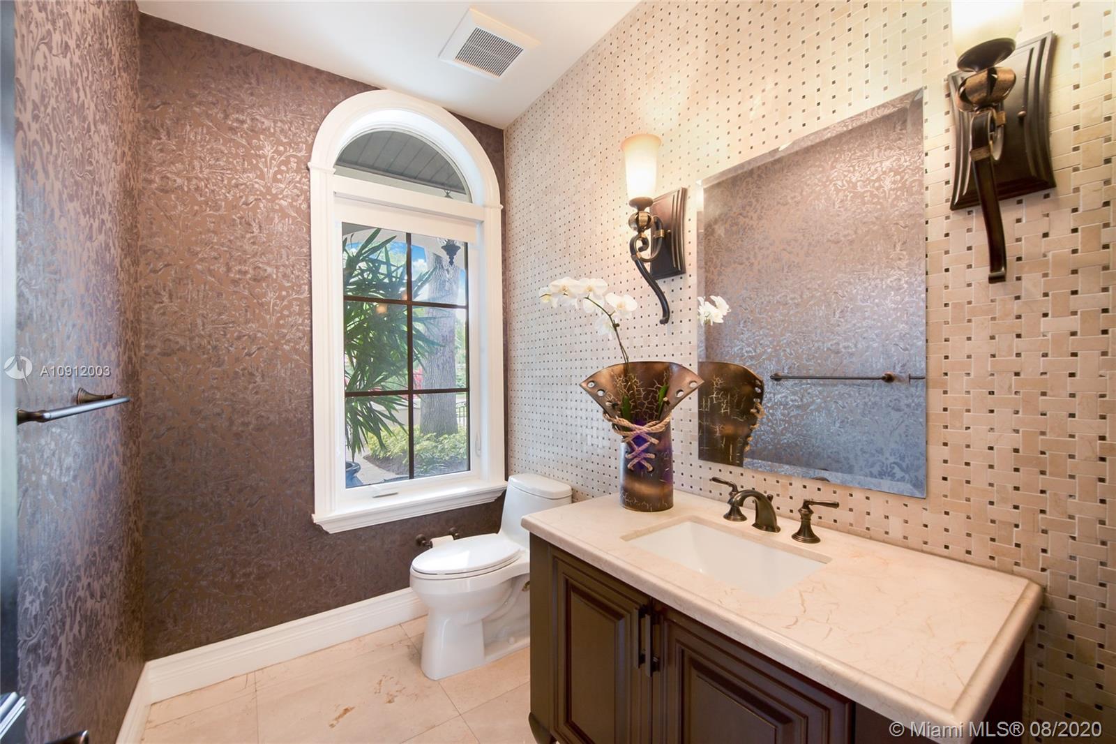 Spectacular one of a kind Home in the Heart of the Gables. Rare Opportunity to own this Gem on a huge triple lot. House boasts a beautiful courtyard entrance centered around a grand oak, circular driveway,2 car garage.Features 6 bedrooms, 6 and a half bath including a large downstairs den/office/media w/fireplace. Marble floors throughout & wood floors in bedrooms. Master suite upstairs w/2 large walk in closets, spacious bath suite & covered terrace overlooking the pool. Kitchen equip w/ Top of the line appliances include Wolf & Miele, oversized island & quartz countertops. Includes a Crestron sound system throughout, impact windows & doors, and grand ceilings. Formal dining room, family & living room that open out to covered terrace & pool. Built in 2015