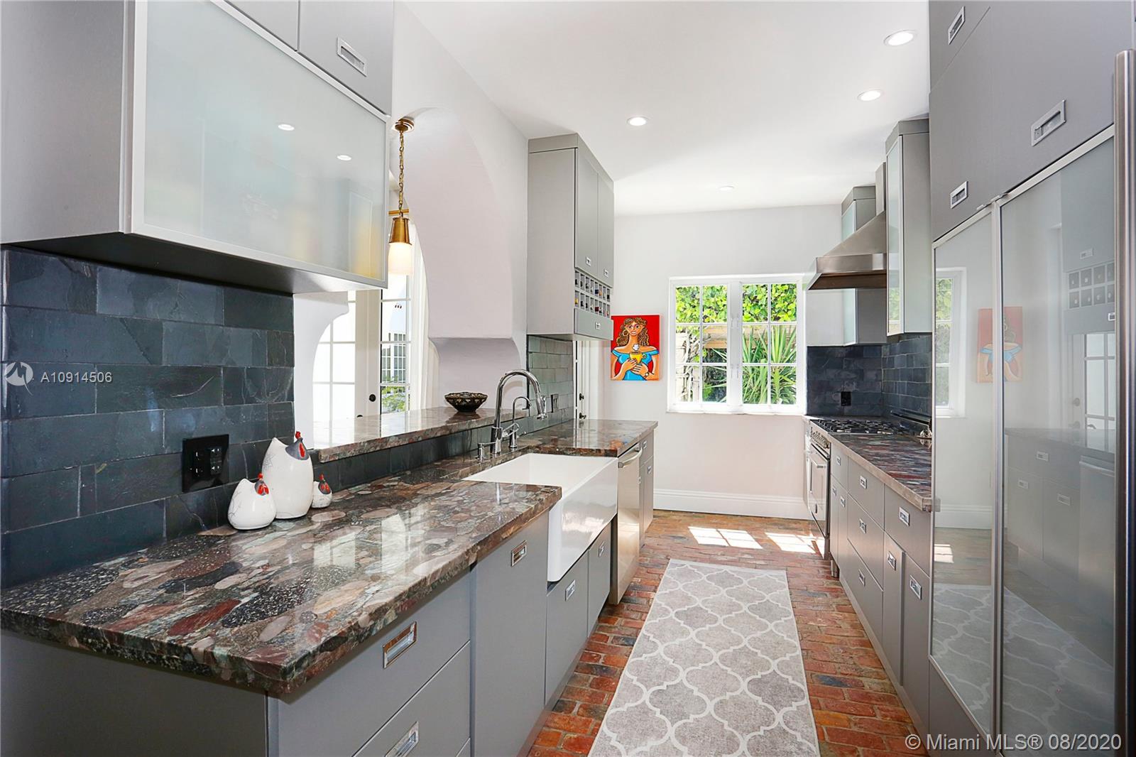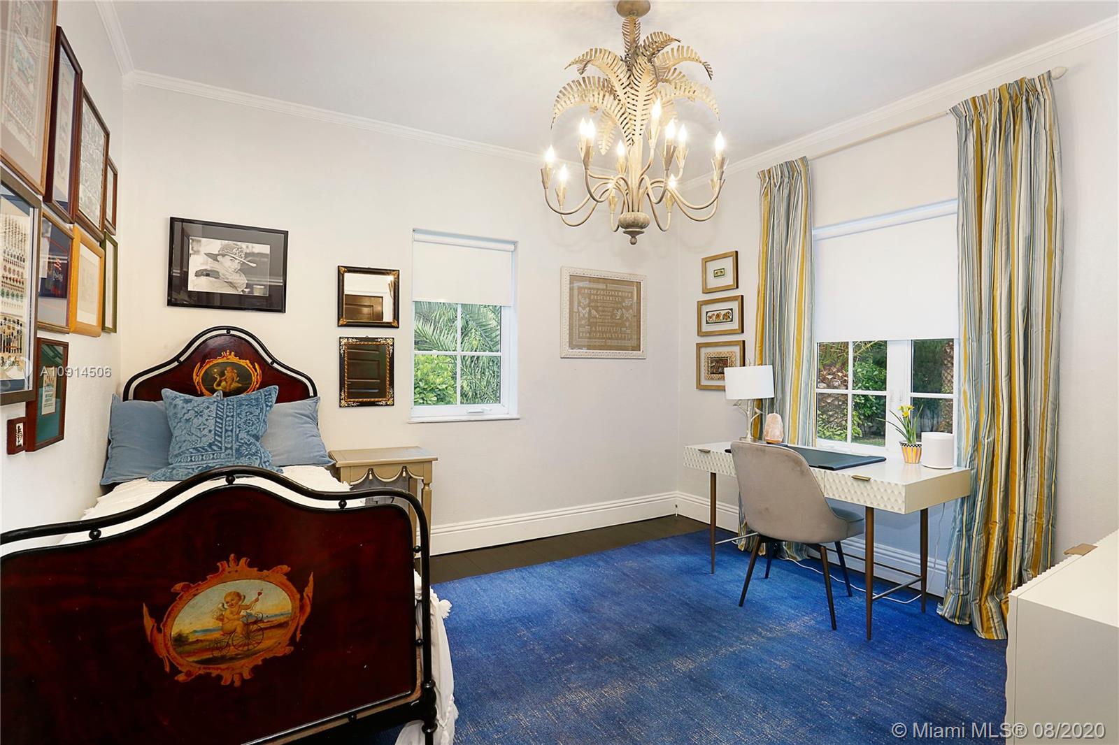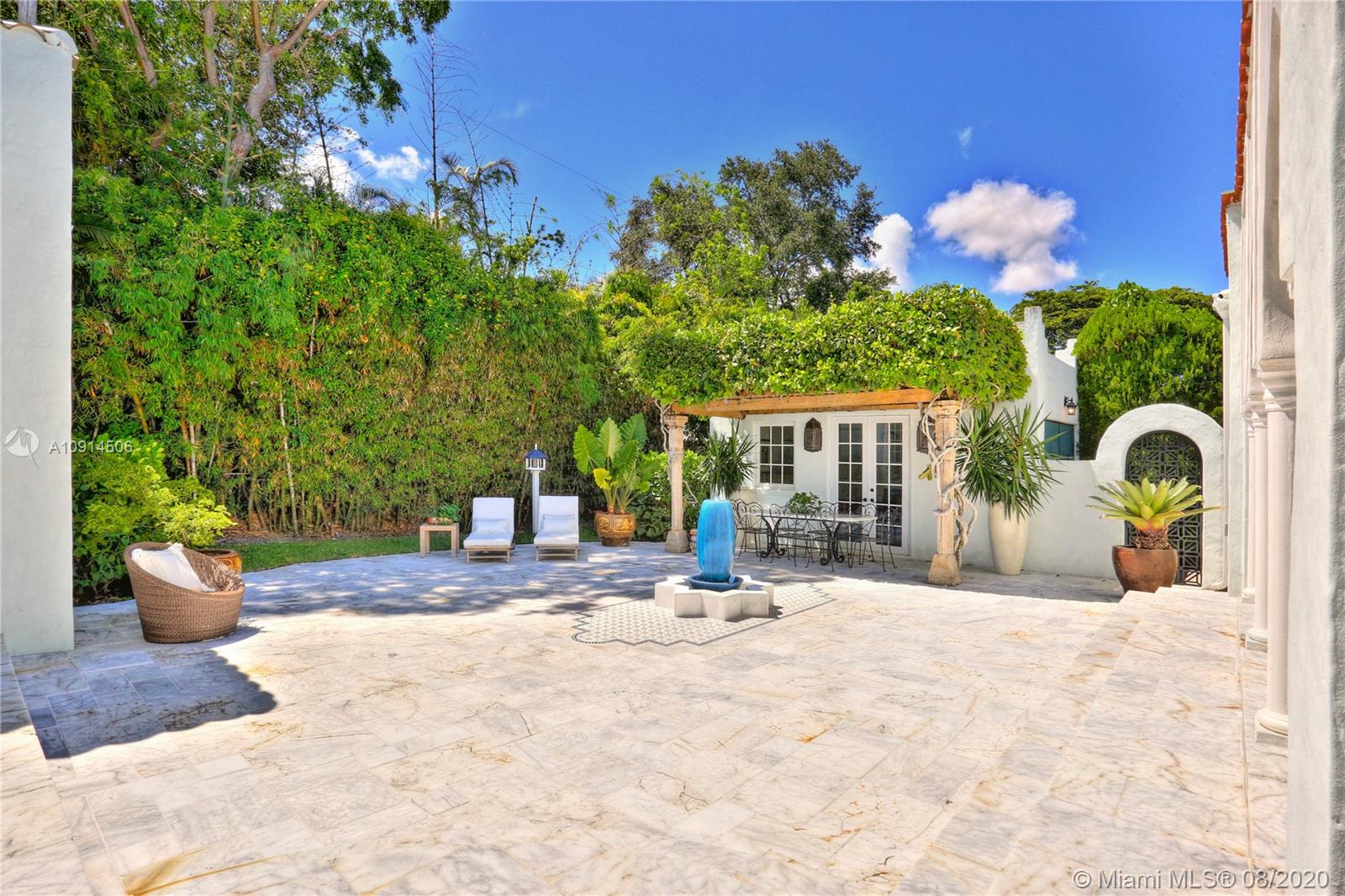 Distinctly unique residence with numerous upgrades, superior details, designer finishes and high ceilings. An oasis in Coral Gables. Upon entering the home your eyes are drawn to the 20ft vaulted ceiling in the foyer. The living areas, home library and generous bedrooms with custom closets are filled with natural light filtered through the floor to ceilings impact windows and French doors. Master bedroom with seating area, custom walk-in closet and large master bath with steam shower. Private terrace off of the master has marble pavers and is a sanctuary for meditating, relaxing or greeting the day. A separate detached guest suite or home office is adjacent to the back terrace. At the end of a long day enjoy alfresco dining and entertaining under the beautiful pergola in the backyard.