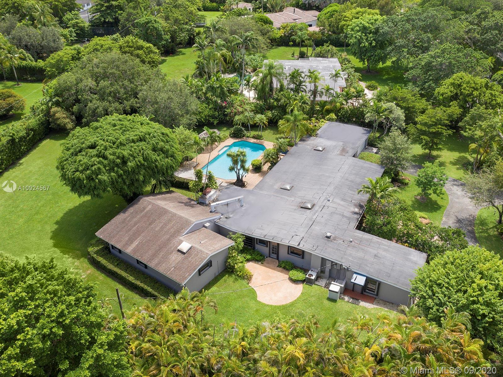 Incredible full acre property on one of Pinecrest's most coveted quiet streets surrounded by gorgeous new mansions. Room for a full North/South tennis court (see survey attachment). Open living space floor plan, beautifully maintained home which was significantly added to in the 80's and updated constantly. Enormous separate master suite with huge space, sitting room/office/closets and large bath. 3 bedrooms 2 baths on other side of the house. 20 x 40 dream pool with huge covered outdoor area, former sauna and more. Accordion shutters, fireplace, gorgeous wood floors, big wood/granite kitchen, and skylights. Some will renovate, some will build anew.