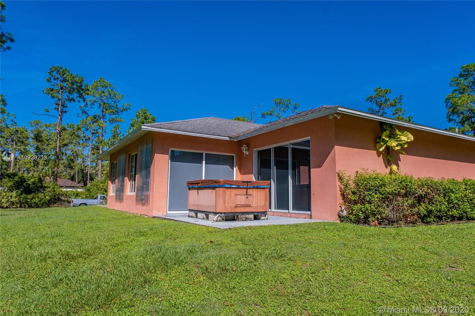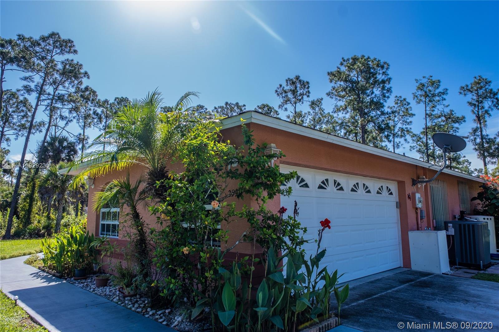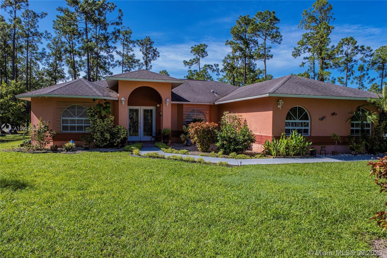 An elegant driveway entrance welcomes you to this impeccable and spacious house on a nicely manicured landscape and very private 2.73 acres in Golden Gate Estates. This property features: asphalt paved long driveway, 3bed/2bath, split bedroom floor plan, tiles throughout, granite counter tops, full size washer and dryer, 2 car garage, only 4 months old a/c air handler and condenser, newer water filtration system, 60 garden sprinklers connect to a separate irrigation well pump, 12’x 24’ patio storage shed, enclosed lanai, and more. Plenty of room for pool, barn, guest house, garage for toys, etc. No neighbors across the street for added privacy. Call listing agent for showings and details.