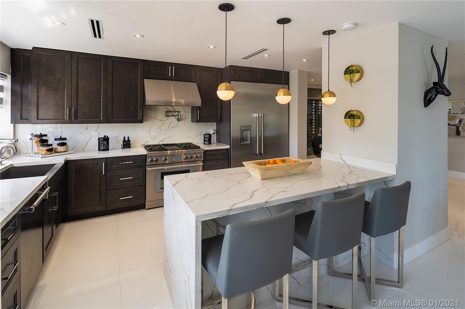 Magnificent Modern Masterpiece! Located in Guard-Gated Gables by the Sea on a 12,000 SF waterfront lot. This 5 bed 6.5 bath home offers 3 floors of luxury living with state of the art features. Dramatic double height windows, glass staircases, spectacular water views, en-suite bedrooms & home gym will not disappoint. Enjoy the combined family room & gourmet kitchen with Thermador Appliances that overlook a resort style patio. Elegant wood ceilings cover the outdoor living area equipped with custom TV’s, a new age summer kitchen & breathtaking Sunrises and Sunsets! The living room is dazzling with a quartz finished fireplace & the dining room has a one of a kind glass enclosed 380 bottle wine cellar. The media/card room with TVs & wet bar is perfect for spending time with family and friends