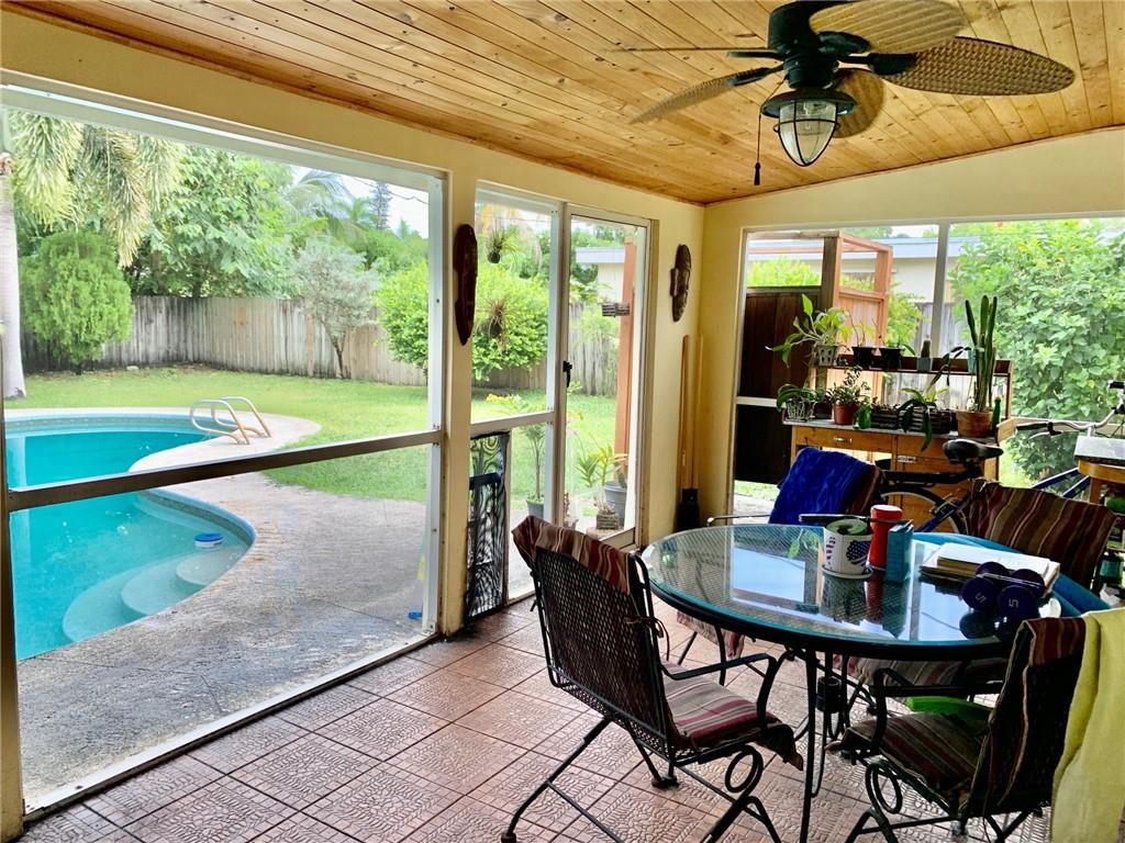 PERFECT 3 BEDROOM, 1 BATH STARTER HOME W/ FREE FORM POOL, A HUGE FENCED REAR YARD & OUT DOOR PRIVATE SHOWER~~~~~NEW SHINGLE ROOF IN 2019~~~~~AC 5 YEARS OLD~~~~~GREAT ENTERTAINING SCREENED PATIO 23X10 W/ BEAMED CEILING~~~~~KITCHEN FEATURES STAINLESS STEEL APPLIANCES & SEPARATE DINING AREA.~~~~~BATHROOM TOTALLY REMODELED WITH STONE TILE WALLS & DECORATIVE GLASS TILE INSERTS.~~~~~3 EXTERIOR DOORS ARE IMPACT; ALL OTHER OPENINGS HAVE HURRICANE PANELS~~~~~HOME HAS A SERVICE WARRANTY W/ PRIDE WHOLE HOME W/ $40.00 DEDUCTIBLE~~~~~PLEASE NOTE; PROPERTY LOCATED ACROSS THE STREET FROM THIS HOME IS COMMERCIAL & DOES NOT OPERATE ON THE WEEKENDS