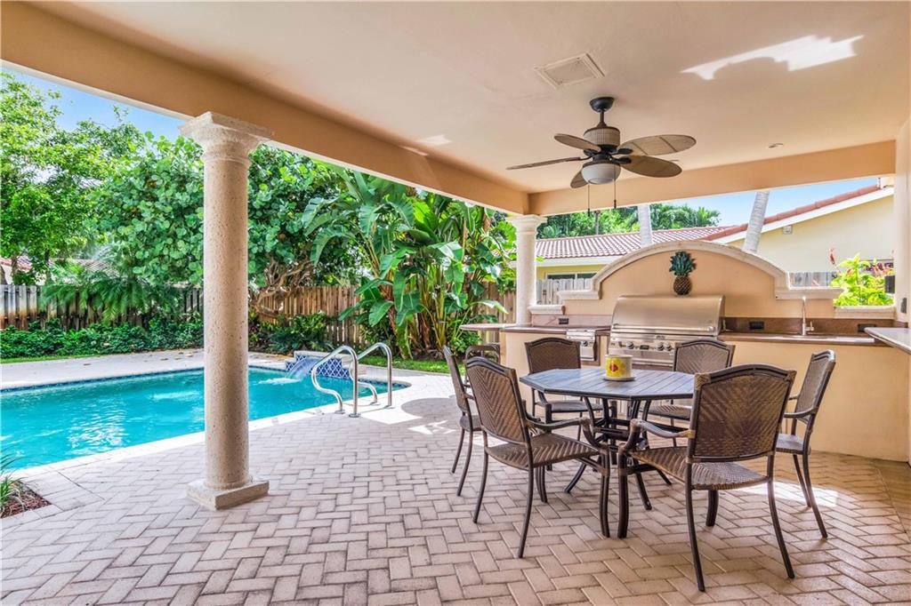 This tastefully updated 3 bed, 2 bath home has the open floor concept. Wolf & Subzero appliances with high end wood cabinets and granite, full wet bar & fireplace. Enjoy the views of the out door seating area, pool, & summer kitchen under extended covered patio perfect for entertaining. Both Master and 2nd bath beautifully updated 2017, basket weave granite flooring, high end fixtures, granite & vanities. Built-ins in all bedrooms with new wood flooring. Impact windows and full house generator. Walk thru house using 3D view... https://my.matterport.com/show/?m=XzTn9KGPsa7&mls=1