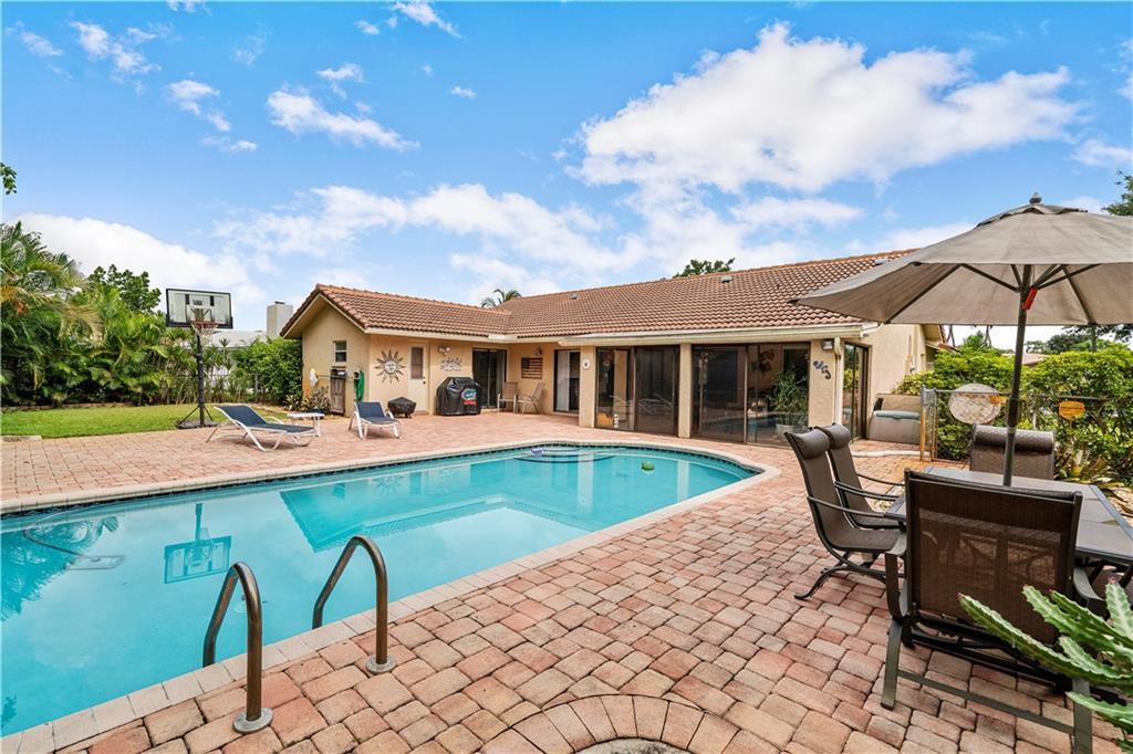 Welcome home to this perfectly landscaped 3 bedroom with a 5 star resort style pool/backyard on a huge 10,750 sf outdoor area.Dramatic high ceilings, open floor plan offering formal dining room, living room and family room all flowing together for family entertaining. Remodeled kitchen with light wood cabinets,granite, soft close drawers, pull outs and large dining area. Glassed in or screened patio (AC vent) offers another Florida living area. Updated guest bath with over sized bath tub/glass doors, granite/ 2 sinks.Interior laundry room plus 2 car garage and driveway can park 6 cars.Large bedrooms & cabana master bath. Paver patio, basket ball and plenty of seating area for enjoying open pool. All the conveniences surrounding this popular neighborhood within minutes. NO HOA!.