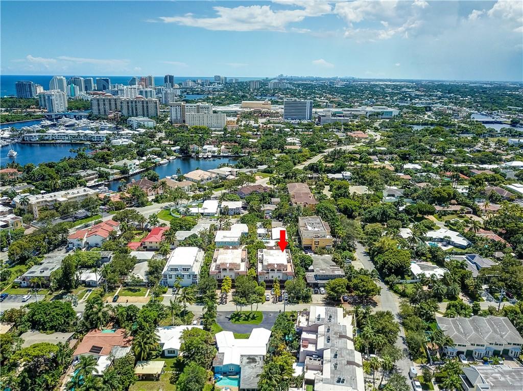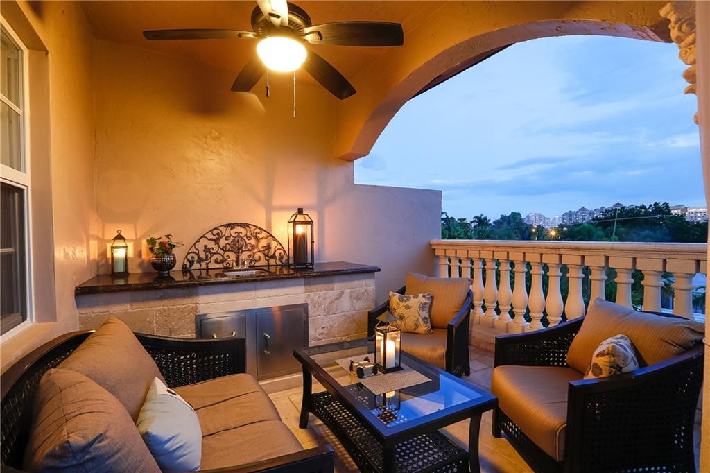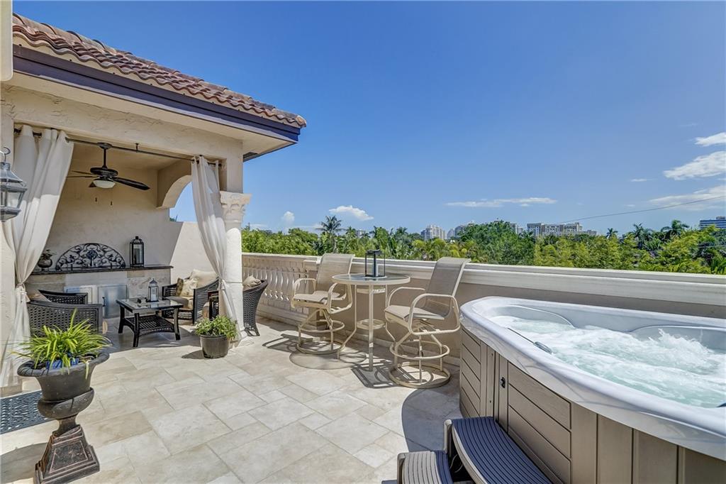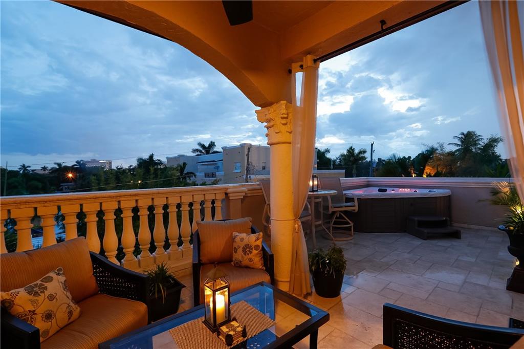 Pristine Coral Ridge tri-level townhome with 2-car garage and impact doors and windows offers three levels of French cut marble flooring throughout and curved marble staircase. Ground living area includes kitchen with high end finishes, wet bar, main living area and half bath. Level two opens on a loft with Juliet balcony that's positioned between the master with two walk-in closets and the second bedroom with enormous walk-in closet, 2nd full bath and conveniently located laundry. Third level features large family room or optional 3rd bedroom and full bath that leads to marble-floored rooftop terrace, sunset views, wet bar and hydrotherapy spa. New washer/dryer, new microwave, new Trane A/C, plantation shutters, crown molding, gated courtyard with fountain, lush landscaping,walk to beach