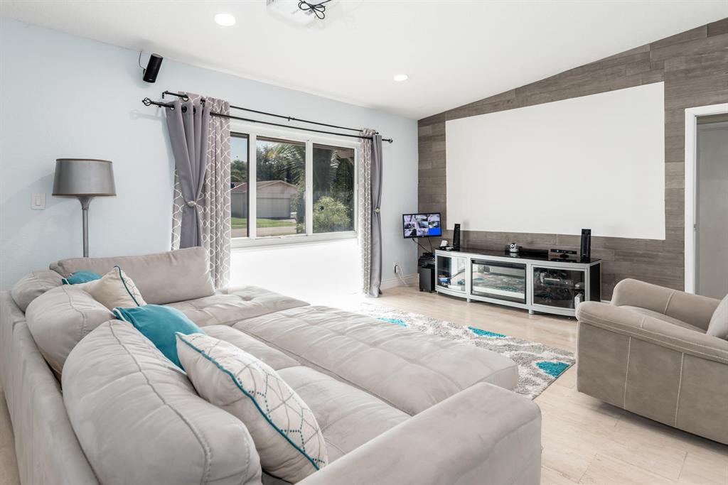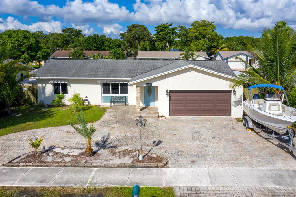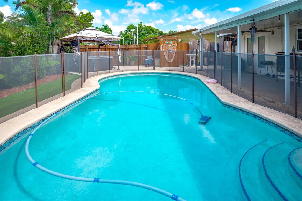 Welcome to Paradise! Beautiful totally updated 3 bedroom 2 bathroom home with hurricane impact windows & doors throughout & spectacular Salt water pool with outdoor shower & Gazebo for plenty of outdoor living. Travertine floors throughout living/kitchen area with beautiful stove top island with quartz counter-tops & beautiful cabinets. Hardwood floors in master bedroom with walk-in closet & marble top vanity in master bathroom with beautiful shower with jets & LED shower head. Bamboo flooring in the other bedrooms with built in floating organizer in closets. Newer AC with UV antibacterial lamp. Tank-less Hot Water heater. Newer electrical panel in garage. 9 camera system with monitor. Stainless steel appliances. Circular paved Driveway with 2 car garage. Move-in Ready! Priced to sell!
