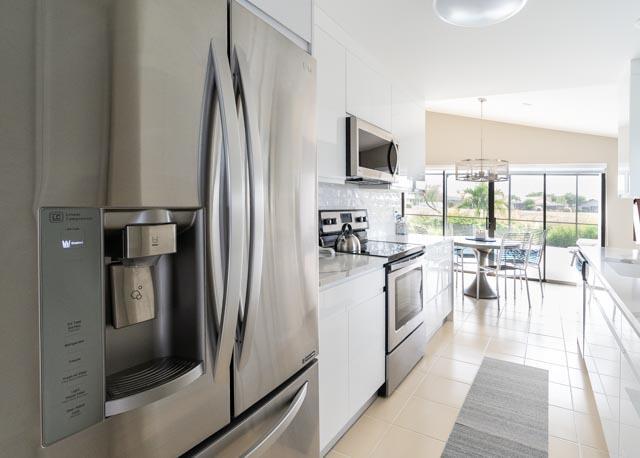 This is a 'must see' fabulous rare gem of a home. It is a bright, warm and welcoming house with professionally designed features and spectacular sunset views. In addition to being a 3 bed 3 full bath home, it has an extension den/family room and bath off of the kitchen that can be modified into a 4th bedroom guest suite. This home was recently renovated with fresh, clean custom lacquer kitchen cabinets, a new LG French door refrigerator, quartz calcatta countertops, a new water heater, and all new air conditioning ducts. The windows have new silhouette treatments, and new LED lighting has been installed throughout. It has a pool entry bathroom and a new pool surround with a marble patio, new pool pump and solar pool heating.