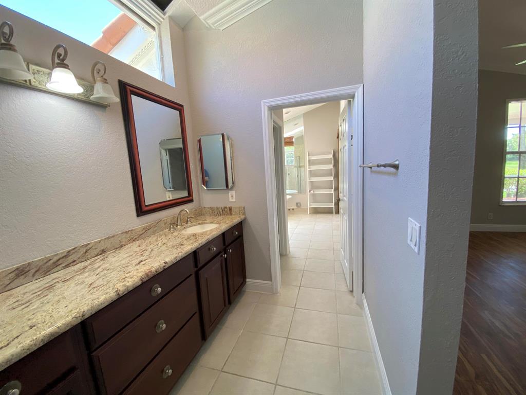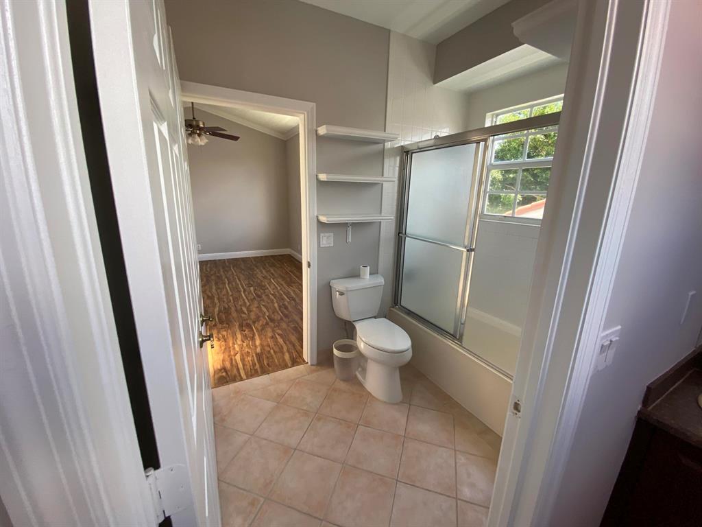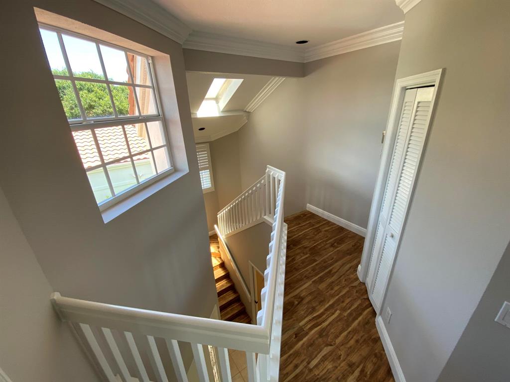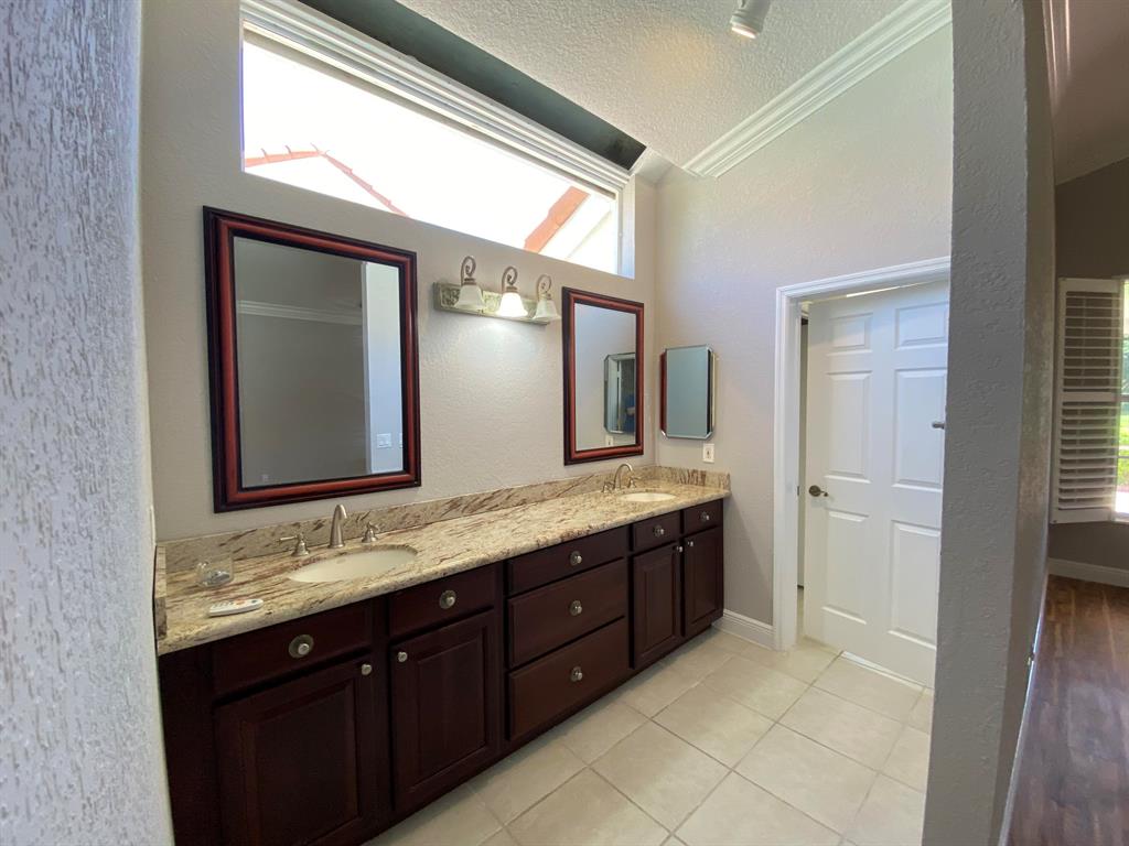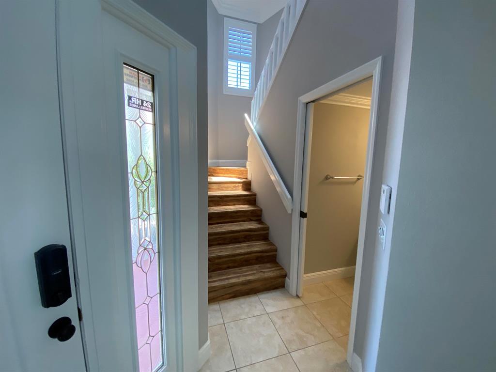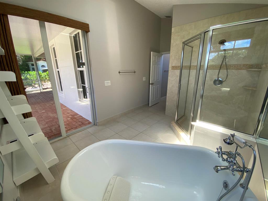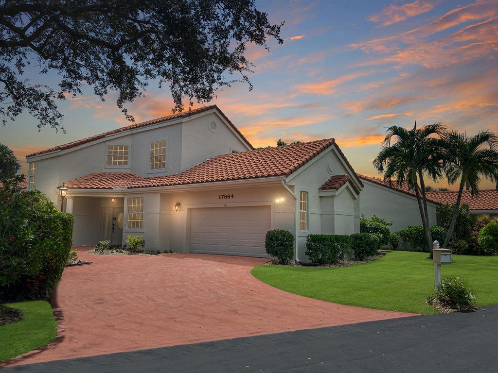 Fabulously beautiful 3 BR 2.5 BA, single family home with a direct golf course view. Large master BR on main level, upstairs has 2 BR with Jack and Jill BA. This 2-story charmer has premium decorative touches including crown molding, plantation shutters, wainscoting and new quartz countertops in the oversized eat-in kitchen. The house has brand new laminate wood floors in all three bedrooms and fresh paint inside and out. Back screened-in patio overlooking golf course was expanded for dining. Side yard is gated for dog. This home has hurricane impact glass. HOA includes lawn care, exterior maint, roof maint and roof replacement, cable and security with 24-hour gate. Membership for golf, tennis and social are available, but not mandatory.