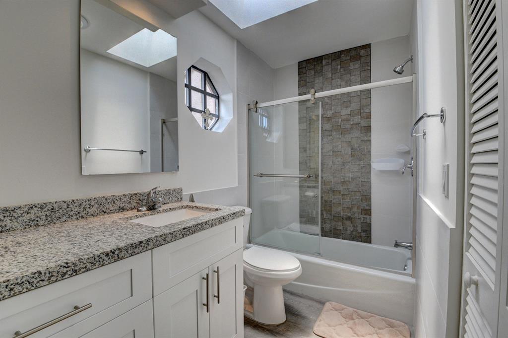 Totally updated town home with master bedroom downstairs and peaceful lake views. Everything updated from floors to ceilings! Gorgeous white kitchen with quartz counters and stainless appliances, built in table, added extra cabinets with wine rack and pass through to dining room. Formal dining and living room have soaring ceilings and beautiful lake views. Floors redone with wood look laminate. Downstairs master has huge closet with custom built ins. Master bath features double sinks, white cabinets, quartz counters, large redone shower and tub with garden views. Upstairs has 2 large bedrooms with nice size closets. One of the A/C units replaced. Back yard has brick pavered patio and private in ground hot tub. Landscaping recently updated. Walking distance to community pool.