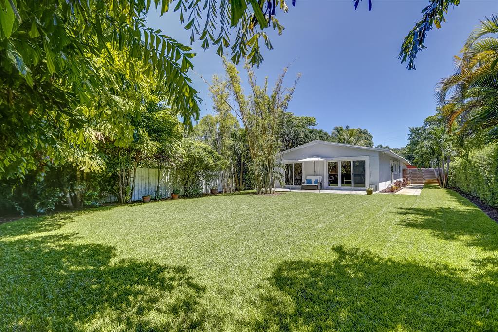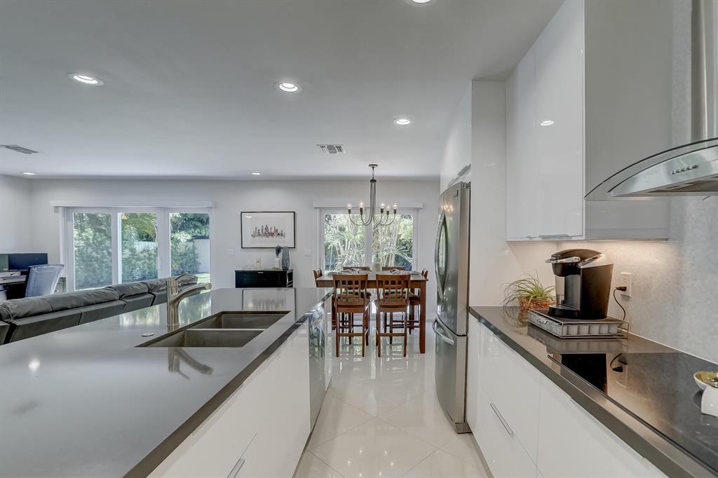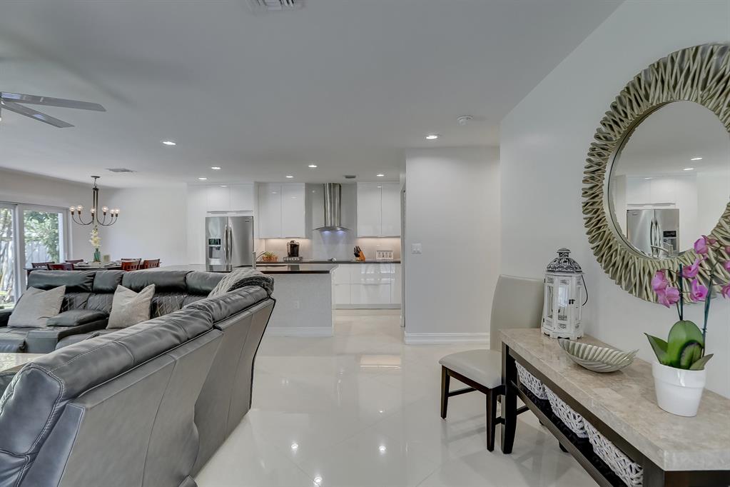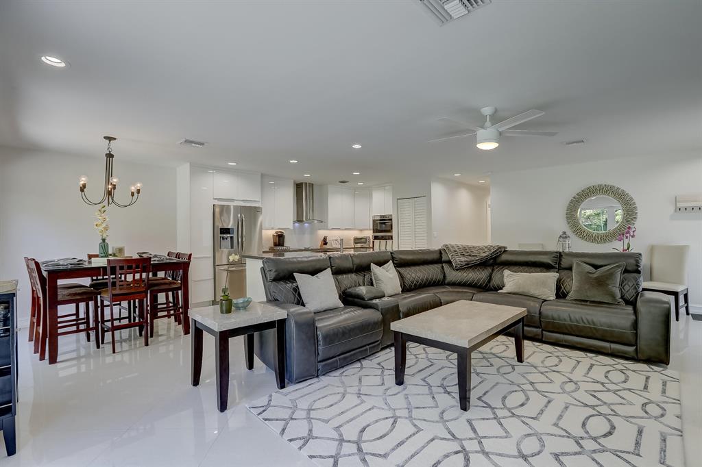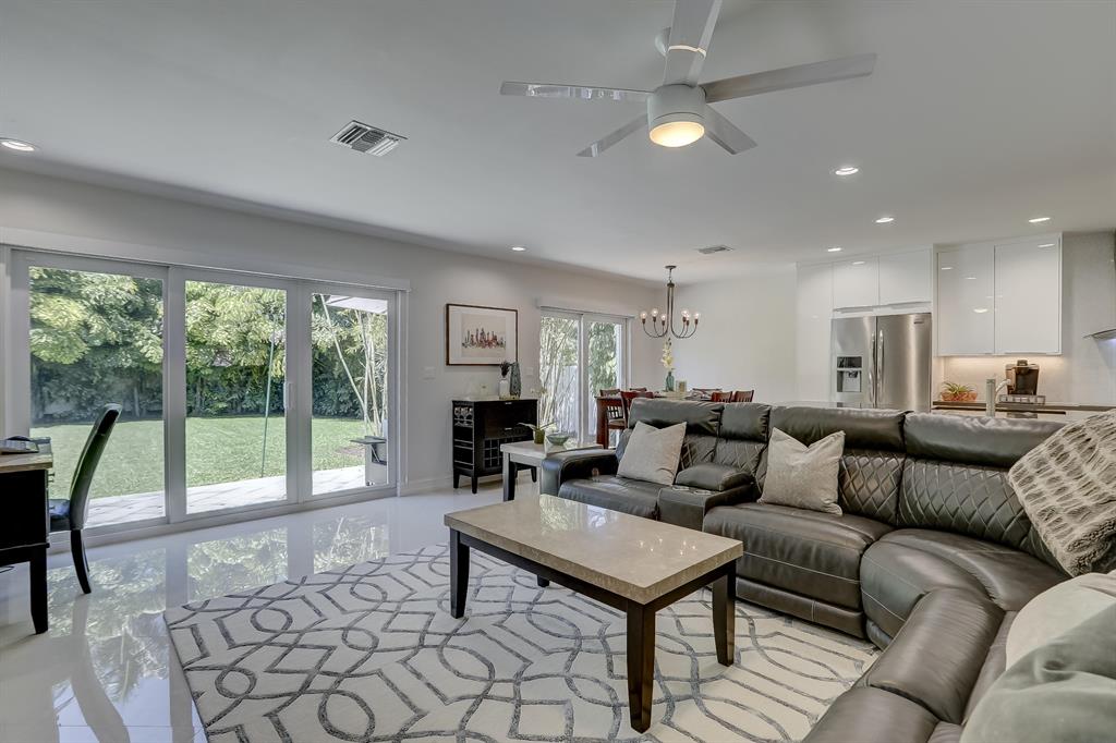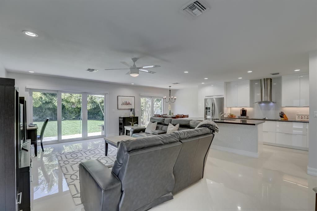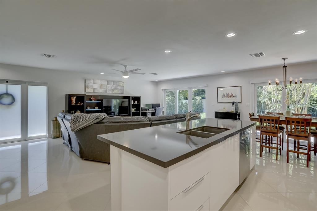 WOW! This beautifully preserved mid-century modern home has been completely renovated, with impact windows, gleaming porcelain tile flooring and neutral paint throughout. The great room with an adjacent dining area, features an open floor plan, perfect for entertaining. The living area looks out to a fully fenced, secluded tropical oasis with room for a pool. The stylish modern kitchen features soft close drawers and includes a wall oven, microwave, stainless hood over a glass cooktop, dishwasher & quartz countertops. The spacious kitchen island with double sinks, allows for effortless entertaining. Down the hall is the laundry closet with a full-sized washer and dryer as well as the bedrooms & baths. The master bedroom leads into an upgraded master bath, complete with double vanity,