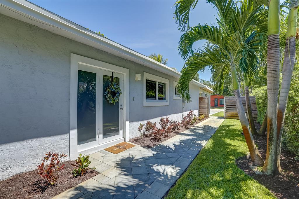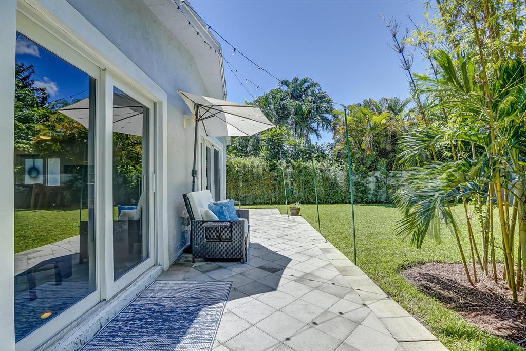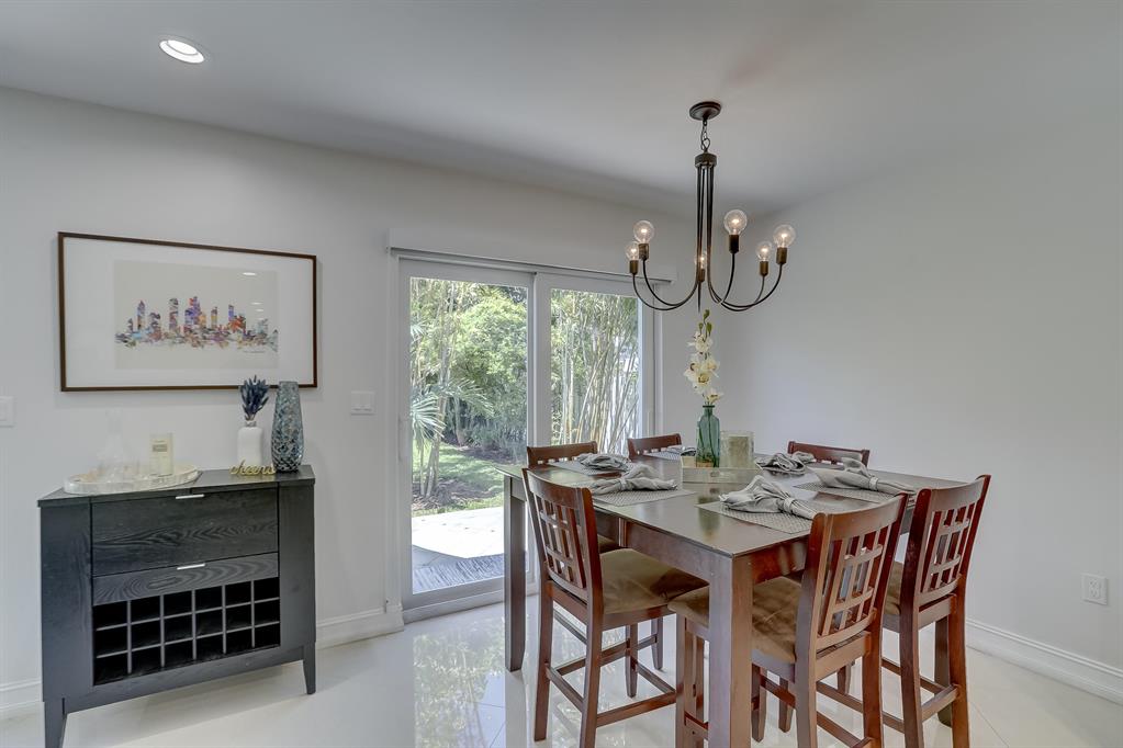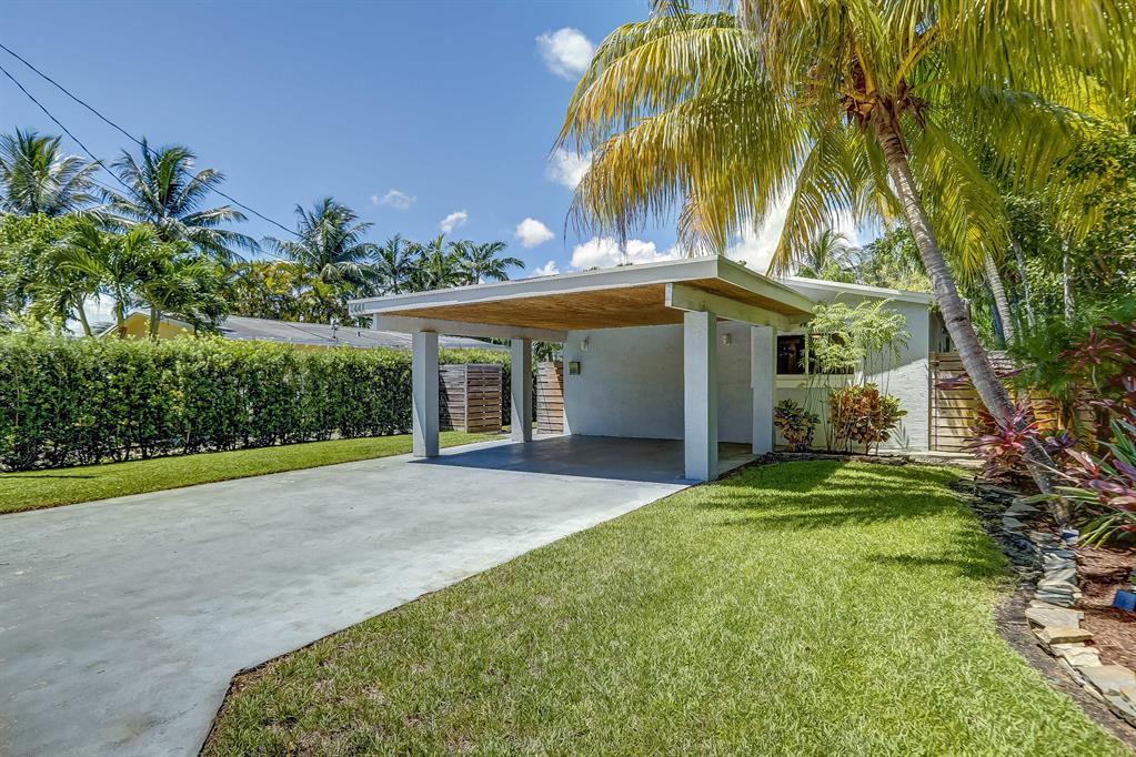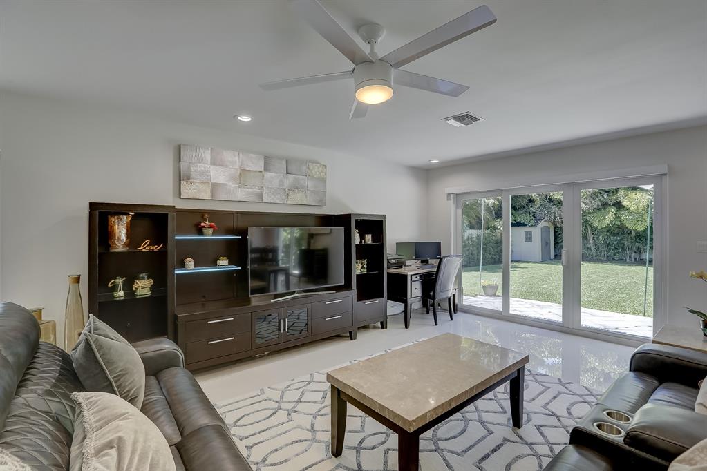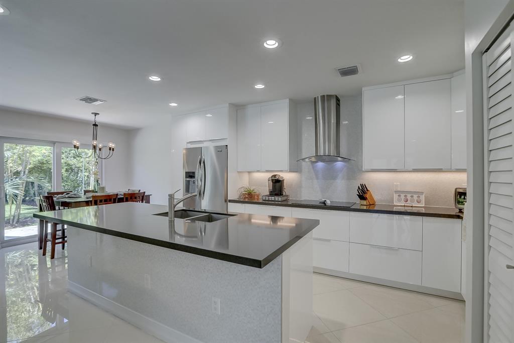 WOW! This beautifully preserved mid-century modern home has been completely renovated, with impact windows, gleaming porcelain tile flooring and neutral paint throughout. The great room with an adjacent dining area, features an open floor plan, perfect for entertaining. The living area looks out to a fully fenced, secluded tropical oasis with room for a pool. The stylish modern kitchen features soft close drawers and includes a wall oven, microwave, stainless hood over a glass cooktop, dishwasher & quartz countertops. The spacious kitchen island with double sinks, allows for effortless entertaining. Down the hall is the laundry closet with a full-sized washer and dryer as well as the bedrooms & baths. The master bedroom leads into an upgraded master bath, complete with double vanity,