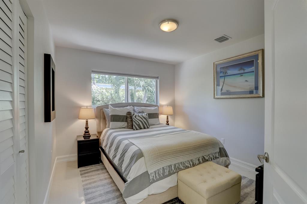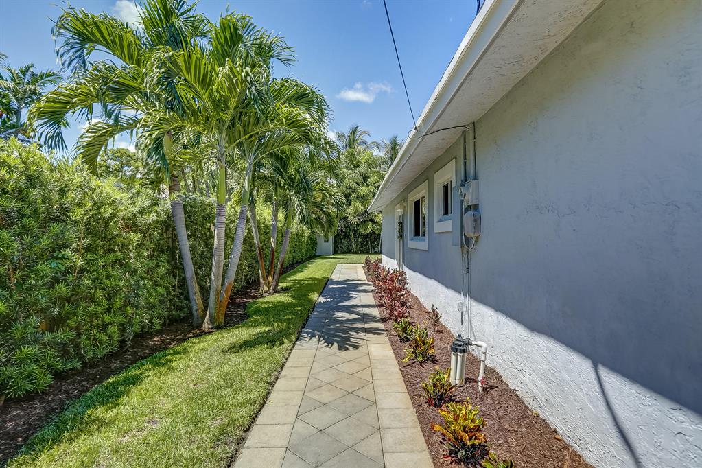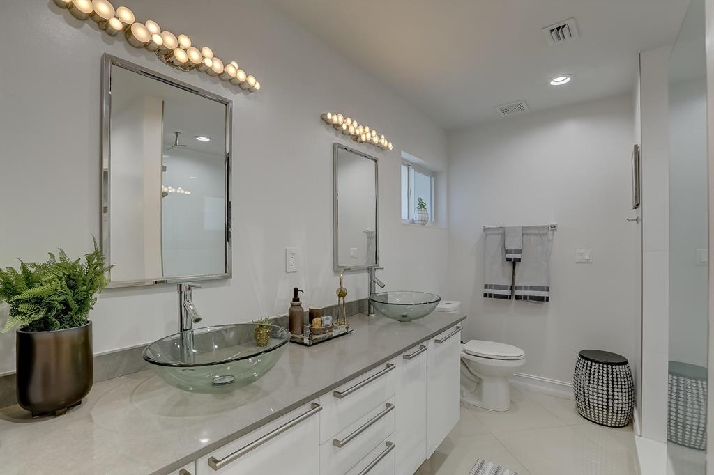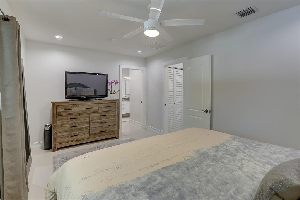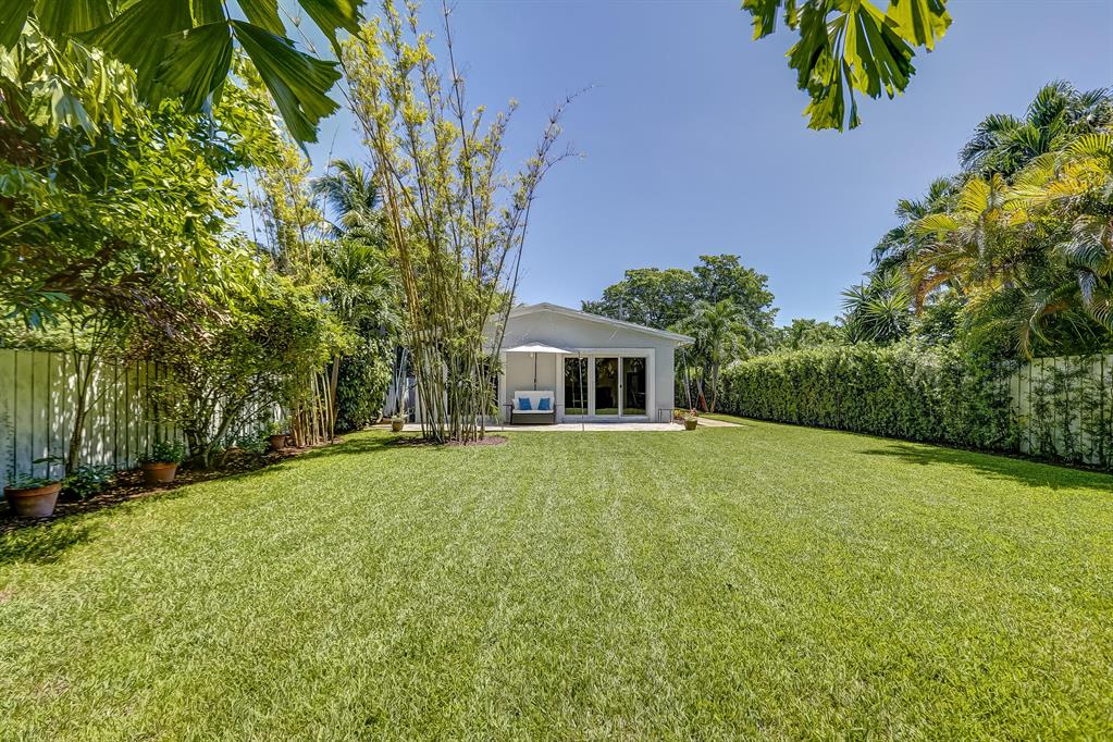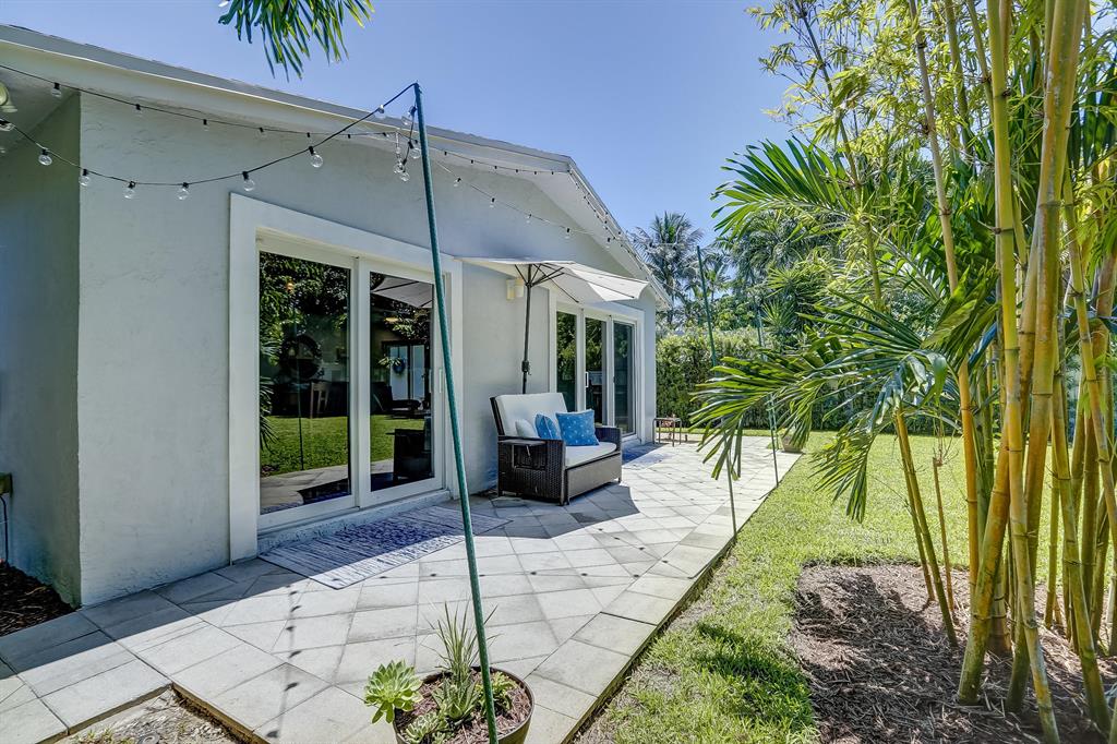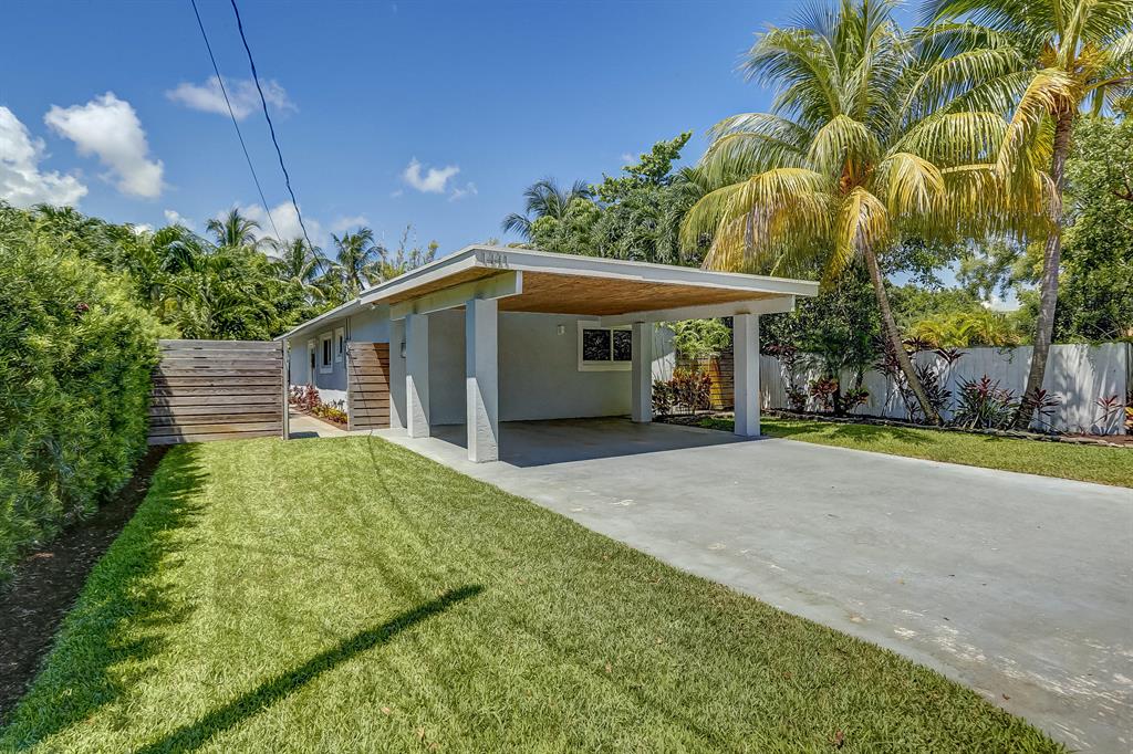 WOW! This beautifully preserved mid-century modern home has been completely renovated, with impact windows, gleaming porcelain tile flooring and neutral paint throughout. The great room with an adjacent dining area, features an open floor plan, perfect for entertaining. The living area looks out to a fully fenced, secluded tropical oasis with room for a pool. The stylish modern kitchen features soft close drawers and includes a wall oven, microwave, stainless hood over a glass cooktop, dishwasher & quartz countertops. The spacious kitchen island with double sinks, allows for effortless entertaining. Down the hall is the laundry closet with a full-sized washer and dryer as well as the bedrooms & baths. The master bedroom leads into an upgraded master bath, complete with double vanity,