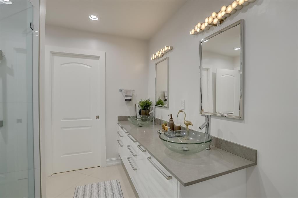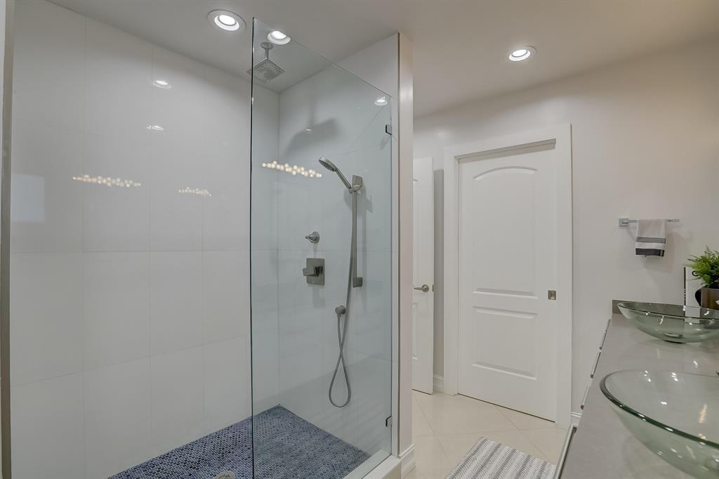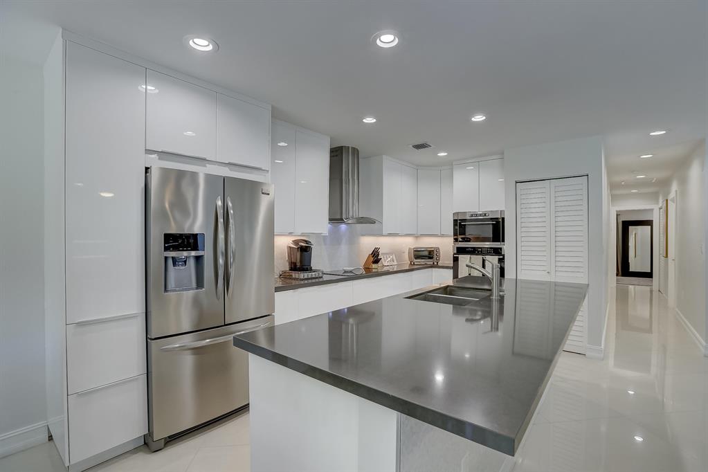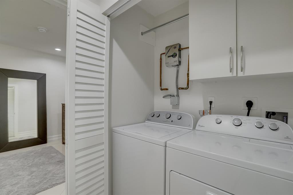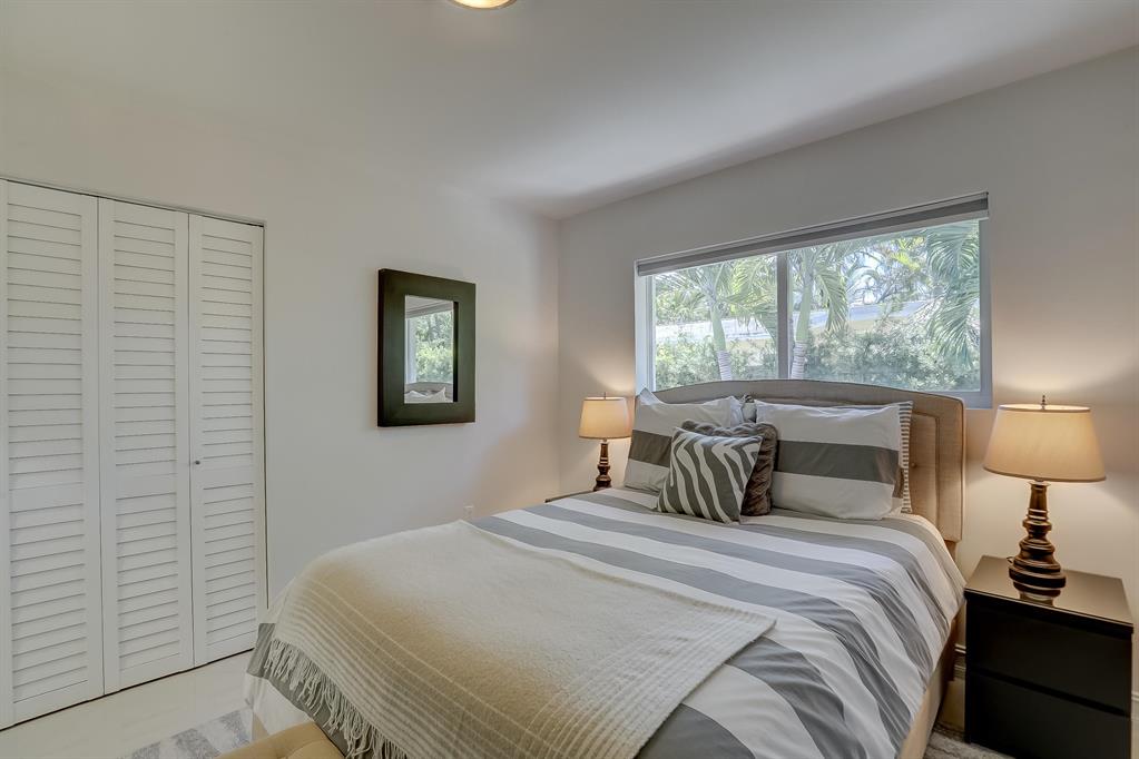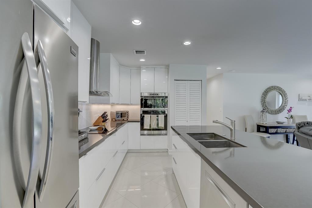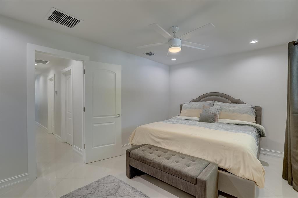WOW! This beautifully preserved mid-century modern home has been completely renovated, with impact windows, gleaming porcelain tile flooring and neutral paint throughout. The great room with an adjacent dining area, features an open floor plan, perfect for entertaining. The living area looks out to a fully fenced, secluded tropical oasis with room for a pool. The stylish modern kitchen features soft close drawers and includes a wall oven, microwave, stainless hood over a glass cooktop, dishwasher & quartz countertops. The spacious kitchen island with double sinks, allows for effortless entertaining. Down the hall is the laundry closet with a full-sized washer and dryer as well as the bedrooms & baths. The master bedroom leads into an upgraded master bath, complete with double vanity,
