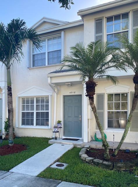MOVE-IN-READY!!! Spacious 2 bedroom, 2 1/2 bath townhome. Plank tile downstairs, newer GE smudge proof slate appliances, kitchen pantry, custom blinds on all windows, accordion shutters, custom built laundry closet, private screened in patio under roof with an exterior storage closet.Low HOA includes a gated community, insurance, exterior maintenance, clubhouse and pool overlooking the lake. Plenty of guest parking. Close to shopping and beach. Easy access to all major roads.