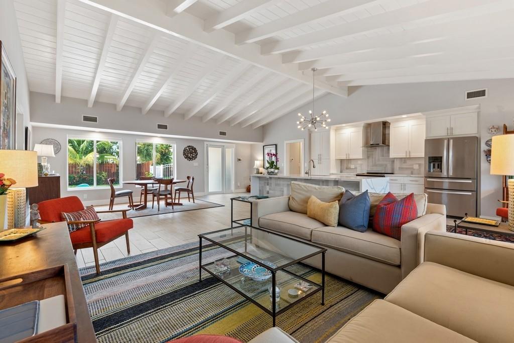 Absolutely stunning renovation and a fantastic, convenient, location highlight this truly turn-key home. Renovated in 2019, and all new underground piping in 2020!! Impact windows and doors throughout, nothing to do but move-in and enjoy! White beamed vaulted ceilings soar above a wonderful great room with generous living and dining areas, a modern kitchen featuring quartz counter tops, huge waterfall island, stainless appliances and solid wood cabinetry and views to the pool area and a lushly landscaped back garden. Split bedroom floor plan, porcelain tile floors throughout, gorgeous updated bathrooms. Large paver patio surrounds the free form pool with plenty of room for lounging and entertaining! Two blocks south of Pine Crest School, and minutes to shopping, dining and beaches!