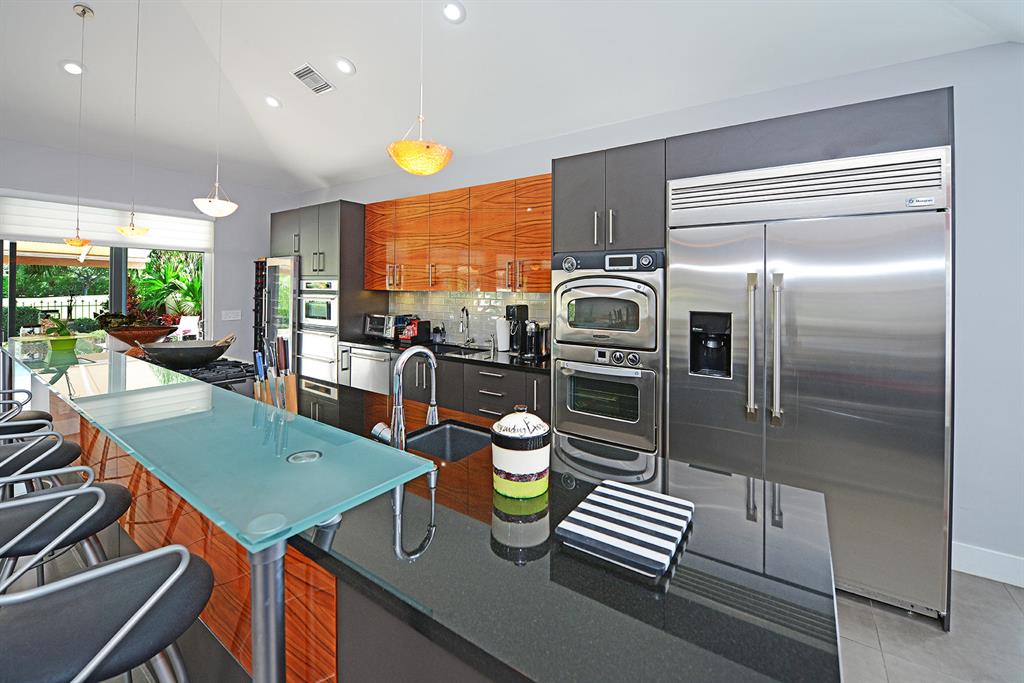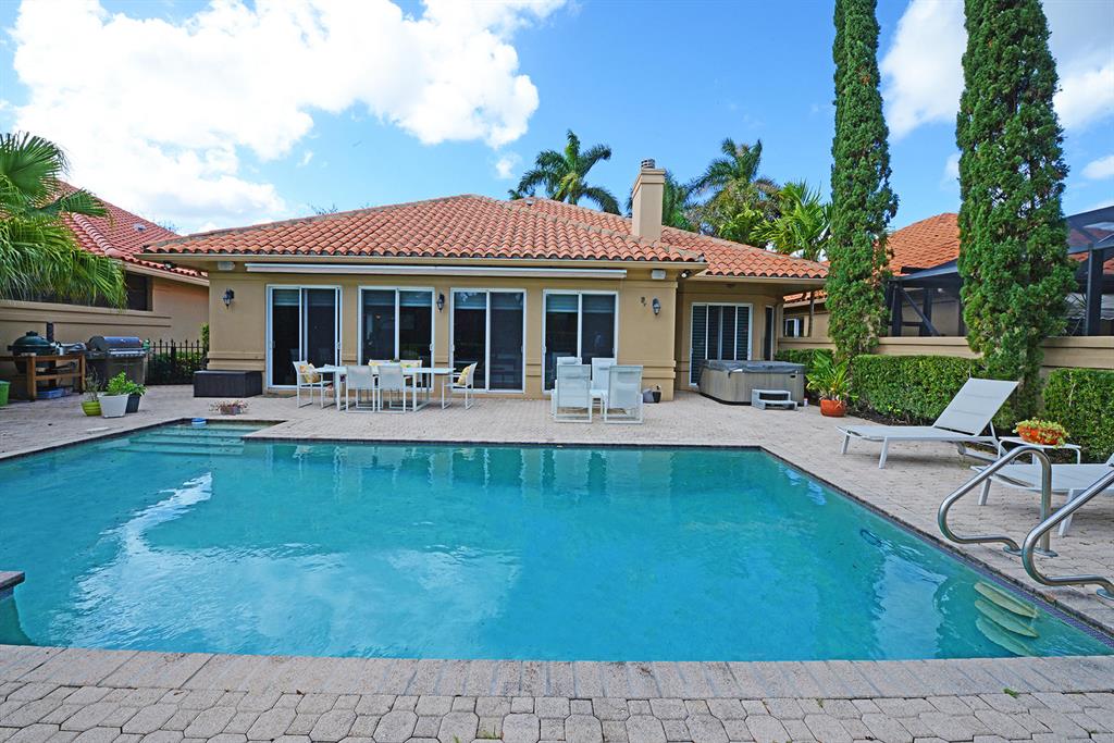 From the moment you enter this fully renovated 3BR/3.5BA golf course residence, you know you have arrived somewhere special. As you walk through the front door and enter the foyer with rectified porcelain tile and vaulted ceilings, you are drawn to the open floor plan and golf course vistas. This home is perfect for entertaining with an open kitchen leading to a great room with custom cabinetry and tremendous outdoor space including a large heated pool and patio with retractable awning for all day comfort. The focal point is the kitchen featuring a gas cooktop, Turbo Chef ovens, warming drawers, a 48 inch double door refrigerator and plenty of storage. The split bedroom plan with updated ensuite baths is ideal for privacy. Impact glass and a generator complete the package.