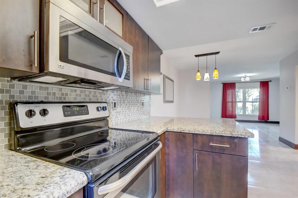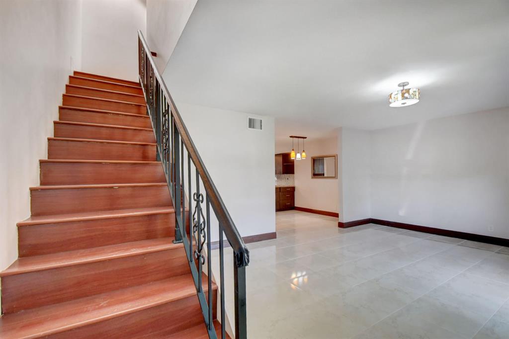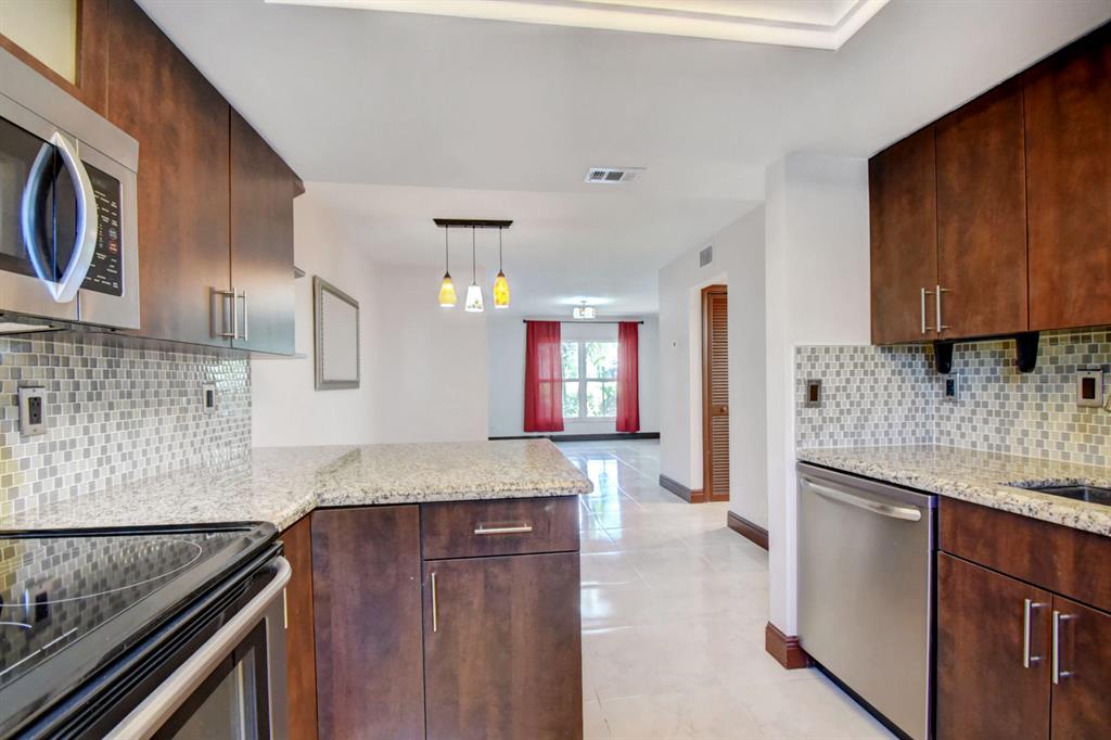 Lovely 3 bedroom 3 bath townhome in Boca Raton east of 95, close to great schools. This 2 story unit's floor plan has one bedroom/bath downstairs and two master suites upstairs. As you enter the home, the living space is open, with a cherry wood floor molding throughout the downstairs living space. The living room, dining room and kitchen all have Tiffany lamps that accentuate each of the rooms. The kitchen has been remodeled with modern cabinets that have plenty of storage, and shelving for decorations, as well as granite countertops and a tile splash back that ties it all together! All appliances were installed in 2017. To make laundry much easier, the washer and dryer are also on the first floor in a separate hallway.