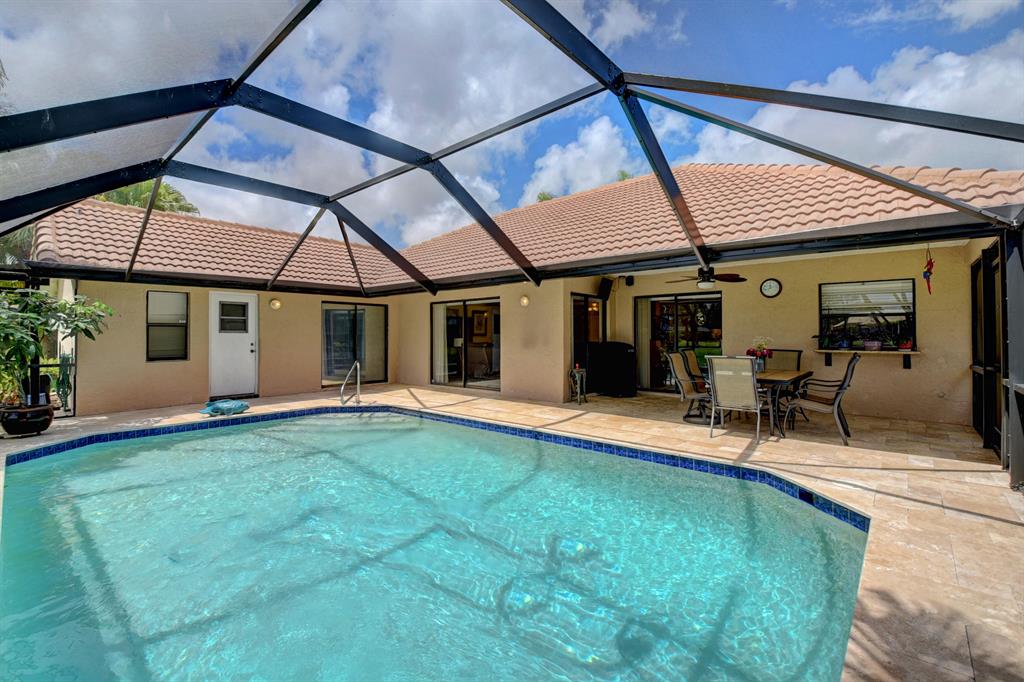 Spacious home with much desired open floorplan. Outstanding views of the 18th T. Impressive kitchen with over sized island containing seating for 4+, sink with disposal and tons of storage. Additional counter area with wine rack. Granitr countertops and backsplash, soft close drawers and pulls outs in pantry. The kitchen window also serves as a pass through for patio serving. Tranquil pool was refinished in 2019, luxurious travertine patio. Screen enclosure replaced in 2019. No carpet, no popcorn, oull down steps for attic storage.Interior laundry room. A/C replaced in 2019. Roof replaced in 2008. Boca Greens has a 24 hr. manned gate. Golf membership available but NOT MANDATORY. All schools are A rated. Great shopping and dining nearby.