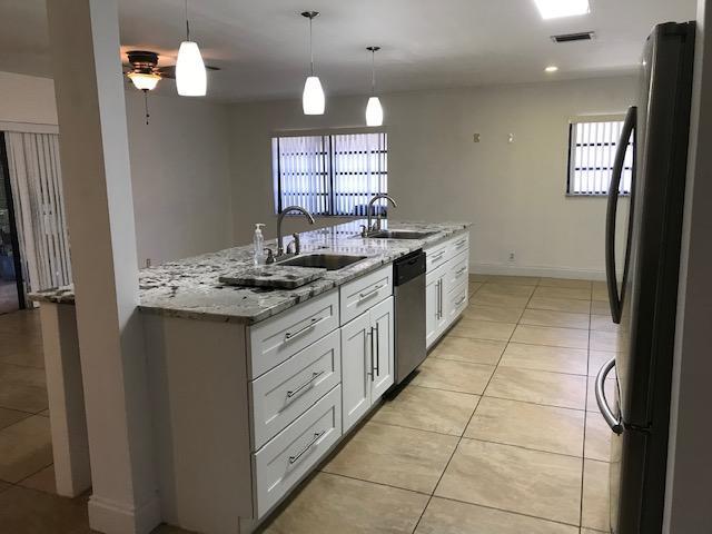 Largest house in this pet friendly 55+ community. Freshly painted open concept living, dining and great room. All new kitchen with stainless steel appliances. Island is huge (14x4') with beautiful marble counter and plenty of 42'' cabinets and self closing drawers. 2 large bedrooms 2 full bathrooms, walk in closets, 2 car garage. 24'' tile floors throughout, screened in patio with hurricane shutters and mexican tile. Plenty of room for entertaining. VIRTUAL TOUR AND/OR FACETIME TOUR AVAILABLE.Low HOA includes clubhouse, salt water pool and basic cable. Unique community in east Boca close to places of worship, Mizner park, 1 mile from the beach, restaurants, FAU, Atlantic Ave and Town Center mall.