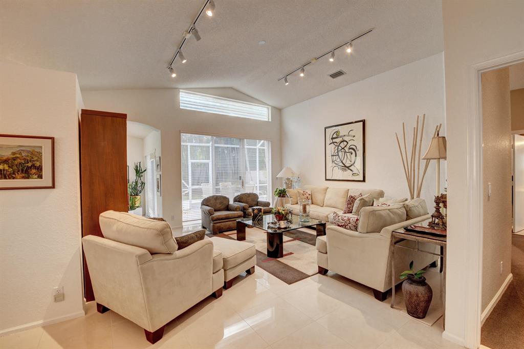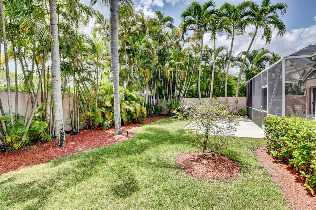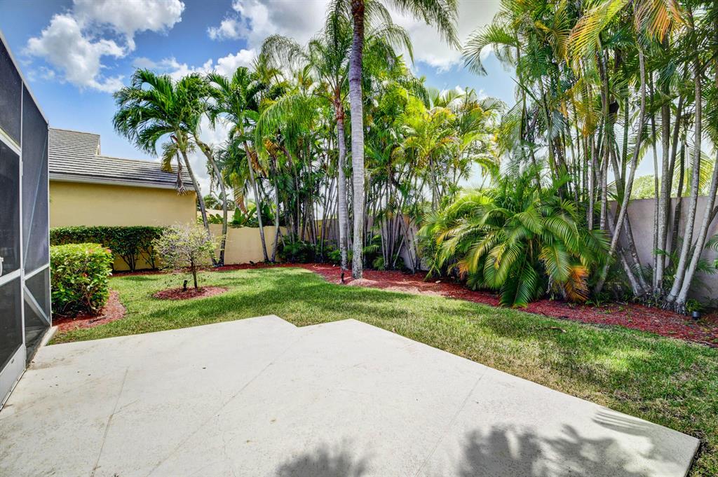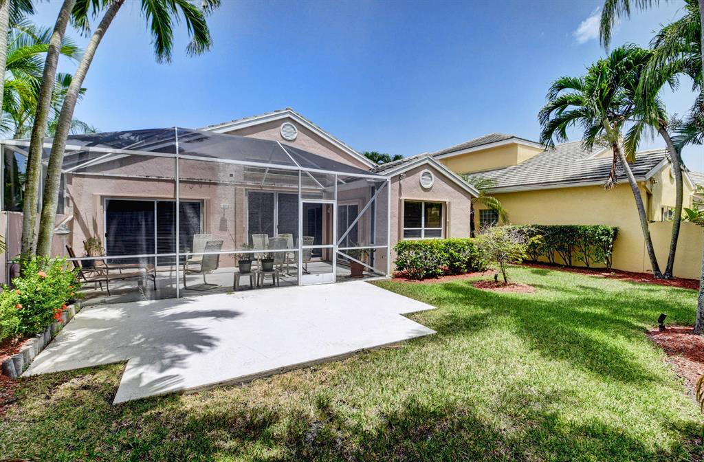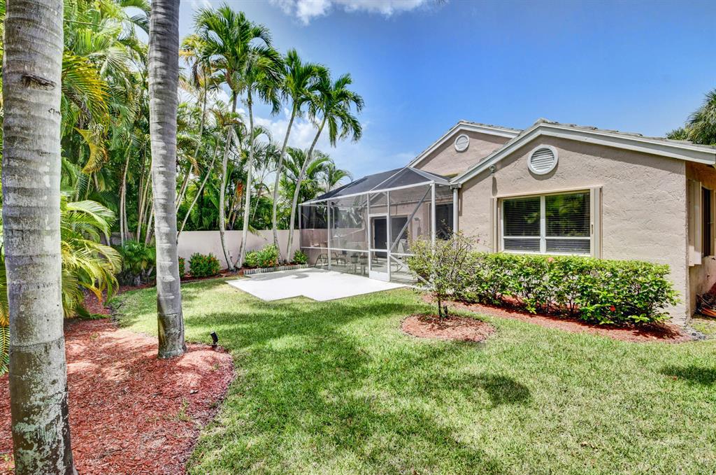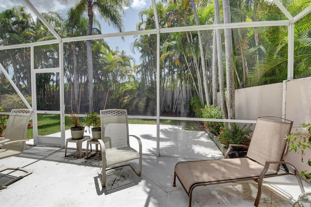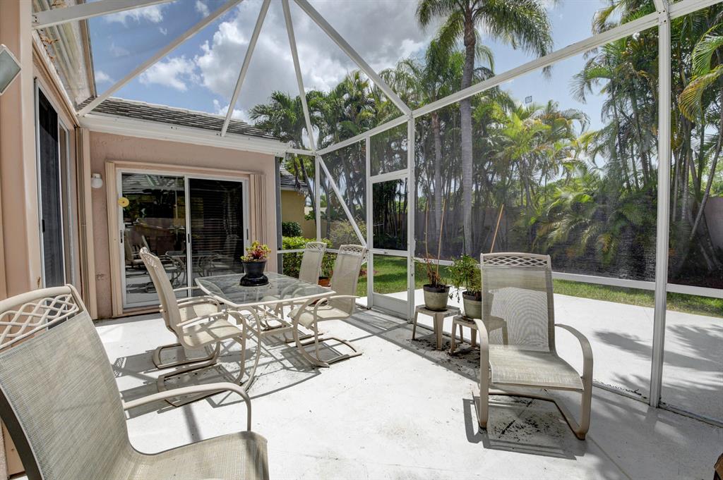 One story home in popular Palms subdivision. This lovely home features a split bedroom floor plan, neutral tile in living areas, updated kitchen with replaced counters, cabinets refaced with custom back splash and refrigerator and dishwasher replaced. Master bedroom has double walk in closets. Master bath has Jacuzzi tub and separate shower. A/C replaced 2019. Roof replaced in 2007. Accordion hurricane shutters through out. Private yard with large screened in patio plus extended patio. 3rd bedroom has perfect built in home office with double desks and lots of drawers and cabinets plus closet. Palms has its own subdivision pool plus maintenance includes cable, alarm, lawn care, pressure cleaning of roof and driveways, painting of exterior of homes and 24 hour manned gate.
