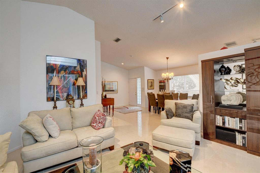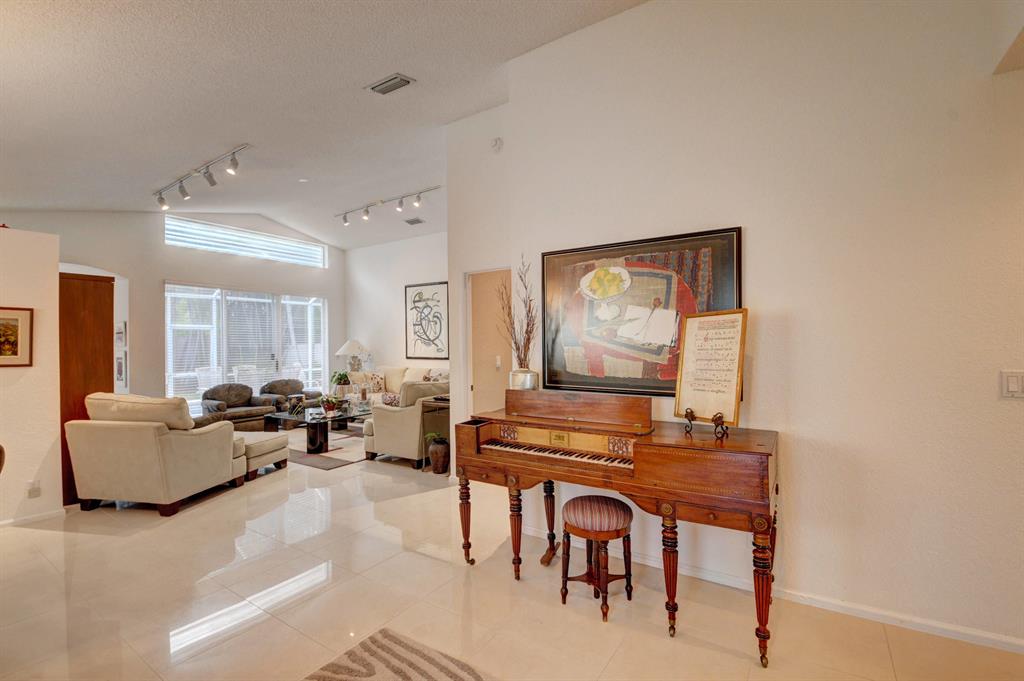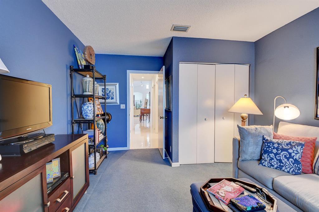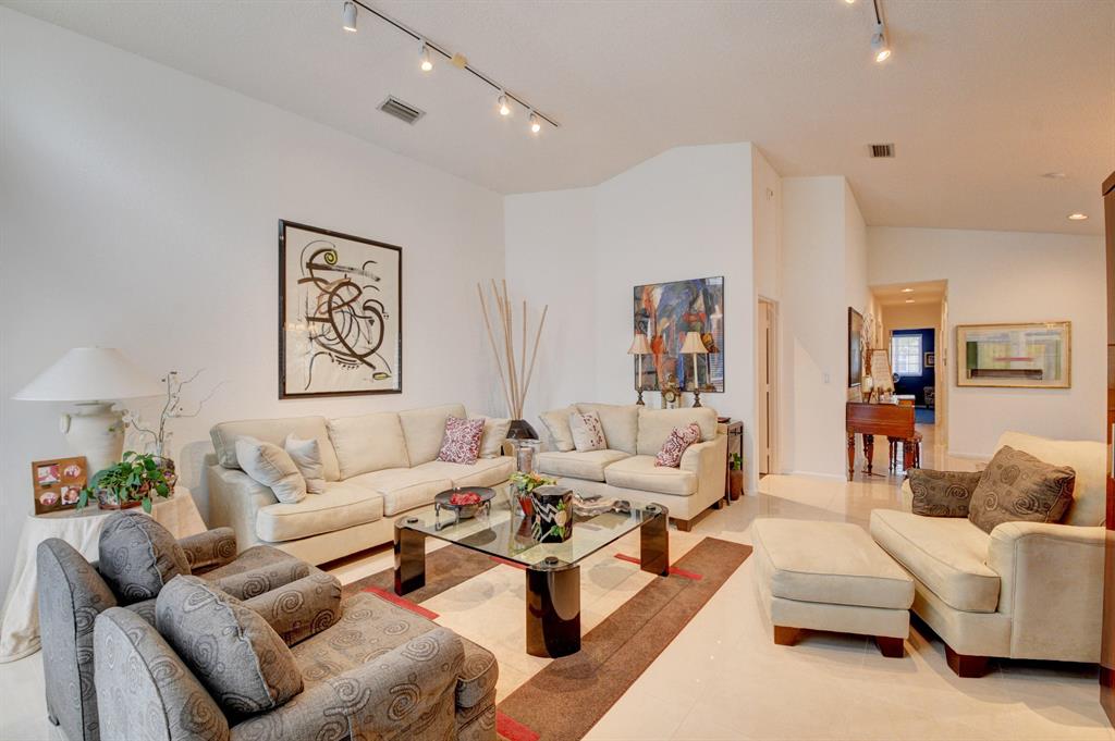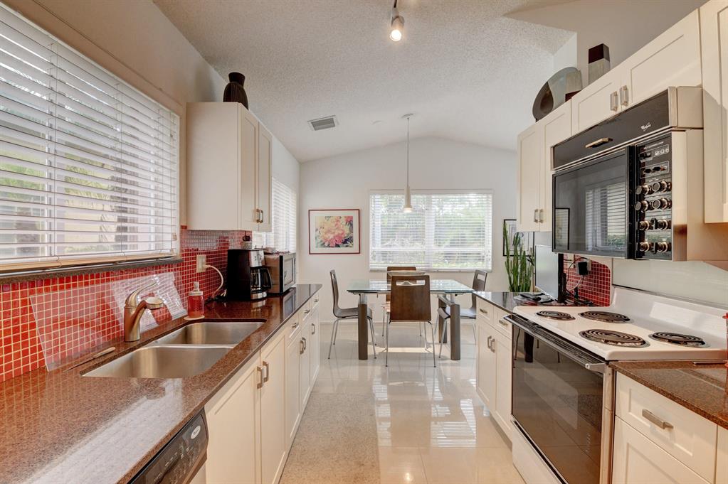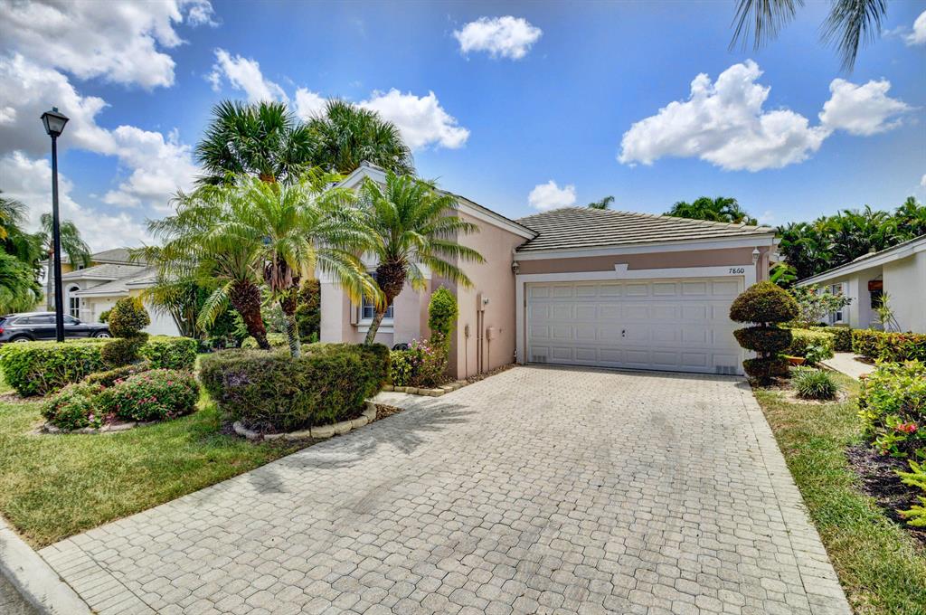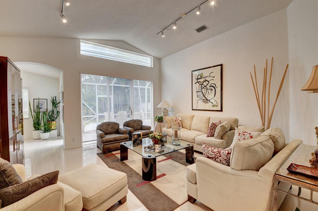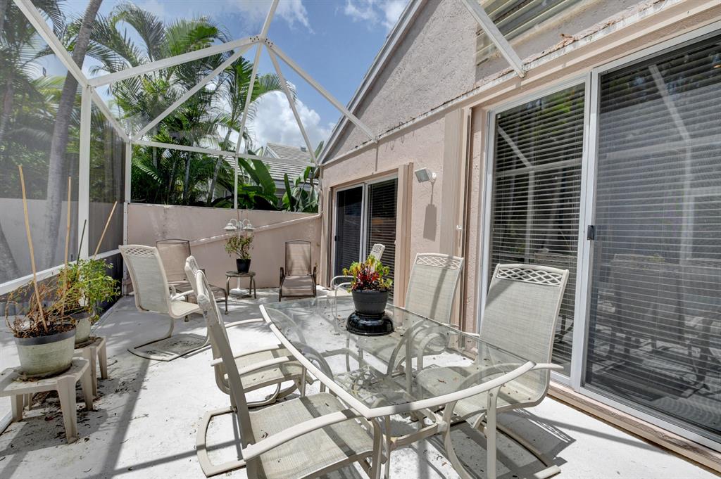 One story home in popular Palms subdivision. This lovely home features a split bedroom floor plan, neutral tile in living areas, updated kitchen with replaced counters, cabinets refaced with custom back splash and refrigerator and dishwasher replaced. Master bedroom has double walk in closets. Master bath has Jacuzzi tub and separate shower. A/C replaced 2019. Roof replaced in 2007. Accordion hurricane shutters through out. Private yard with large screened in patio plus extended patio. 3rd bedroom has perfect built in home office with double desks and lots of drawers and cabinets plus closet. Palms has its own subdivision pool plus maintenance includes cable, alarm, lawn care, pressure cleaning of roof and driveways, painting of exterior of homes and 24 hour manned gate.