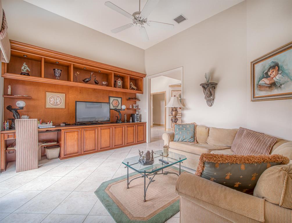 Open, light and bright floor plan with 2 bedrooms plus den and 3 full baths.Ideally located in Bent Creek near Clubhouse, pool and driving range.Diagonal tile flooring throughout, split bedroom plan and lovely screened patio with spa. Spacious kitchen with a separate breakfast area and granite counter-tops, stainless appliances.The den has custom built-ins and a full bath. There are plenty of closets, an inside laundry room for your convenience and two AC units. You will love entertaining or relaxing on the private screened patio. Beautiful lot with lush landscaping and a two car garage make this the perfect place to call home! Meet new friends at the award winning Broken Sound Country Club and Golf Course! A wonderful lifestyle awaits you!