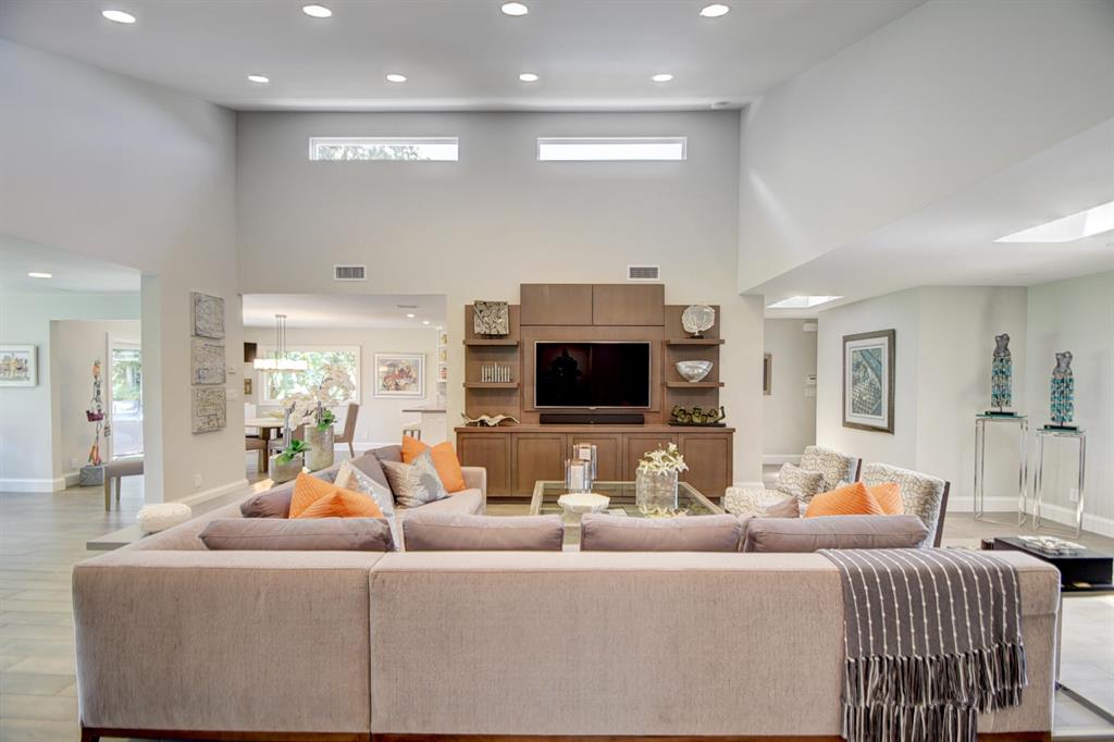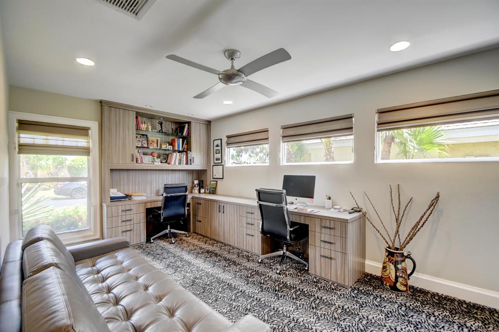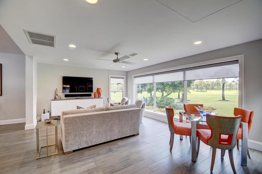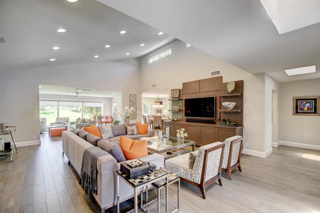 Beautiful, totally redone, 3 bedroom/ 2.5 bath, single family detached home with expansive golf views and extensive landscaping. There is porcelain wood look flooring in the living areas and carpet in the bedrooms. All of the windows are impact glass and it is very open, spacious, light and bright. The kitchen has stainless Jen-Air appliances, quartz counters and marble back splashes. The second bedroom is being used as an office with a custom built-in. The family room is expanded, there is an extra storage closet off of the laundry room, custom extra high hats and custom doors throughout. This wonderful home must be seen. $70,000. Club Membership Mandatory.
