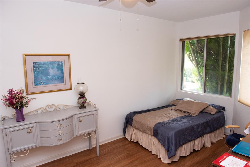 Beautiful light and bright home featuring 3 bedrooms/2 baths/2 car garage and pool!! This home located on a large and private corner lot. NEW ROOF going on. Open concept floor plan with freshly painted walls and many updates. Newer kitchen with new cabinets, granite, backsplash, and more modern appliances. The kitchen opens to the great room which features a living and dining room area. The great room with brand new wood tile floors features 3 sliders that open to a fully fenced backyard that features a recently resurfaced private pool. The master bedroom and second bedroom look out onto the pool and the yard. This master bedroom is large, with newer laminate flooring and fan. The master bathroom also is very spacious featuring a large walk-in closet/changing area: two sinks, roman tub,