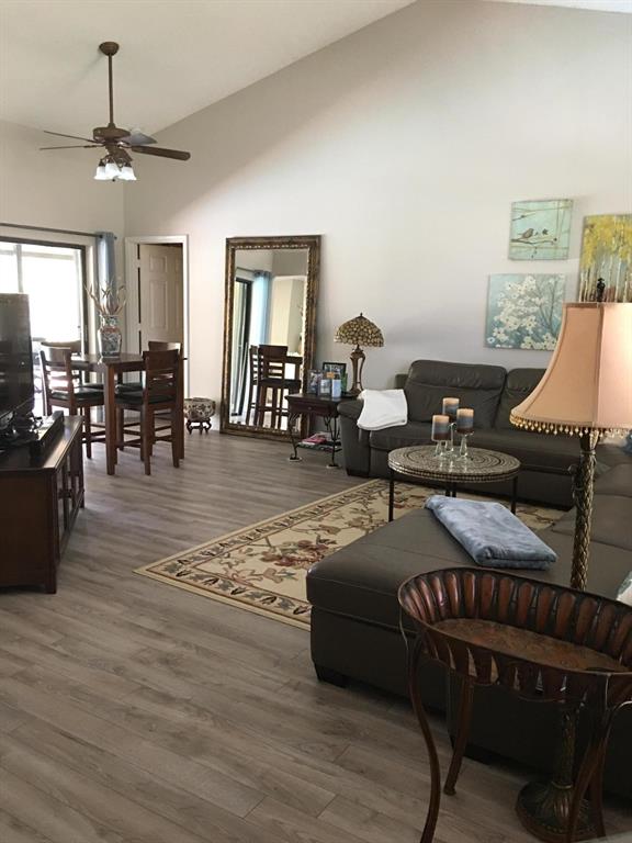 Enjoy a completely upgraded kitchen which boasts new 42-inch white shaker cabinets w/soft close pull out drawers, stainless steel appliances, stunning quartzite countertops. Large quartzite island with wainscoting allows enough room for the whole family. The master bath includes floor to ceiling marble tile, large granite countertop, custom vanity, dual sinks & large walk in rain shower with glass tile accents. The 2nd bath includes porcelain tile flooring, double vanity sink & shower/tub combo w/tiled walls.Wood look laminate flooring thru out the living areas & bedrooms with 5 1/2 inch base board molding. Pavers on pool deck, patio seating area, walkway & driveway. Screen enclosed pool to enjoy serene water & golf course views. Whole house Accordion Hurricane Shutters.